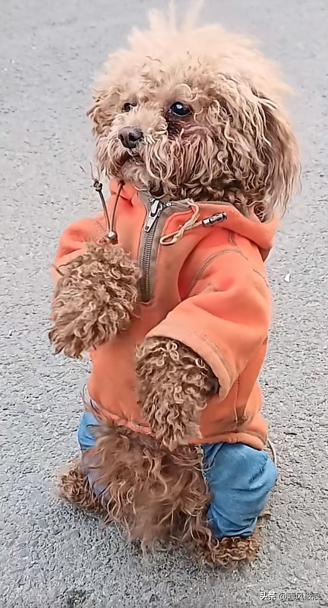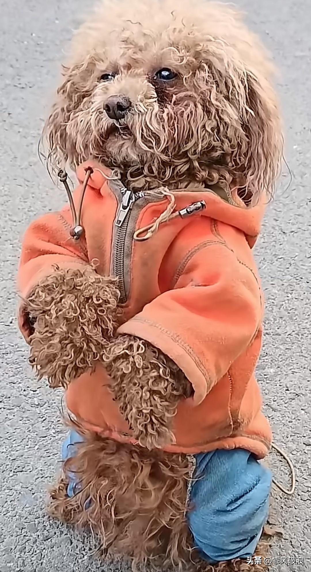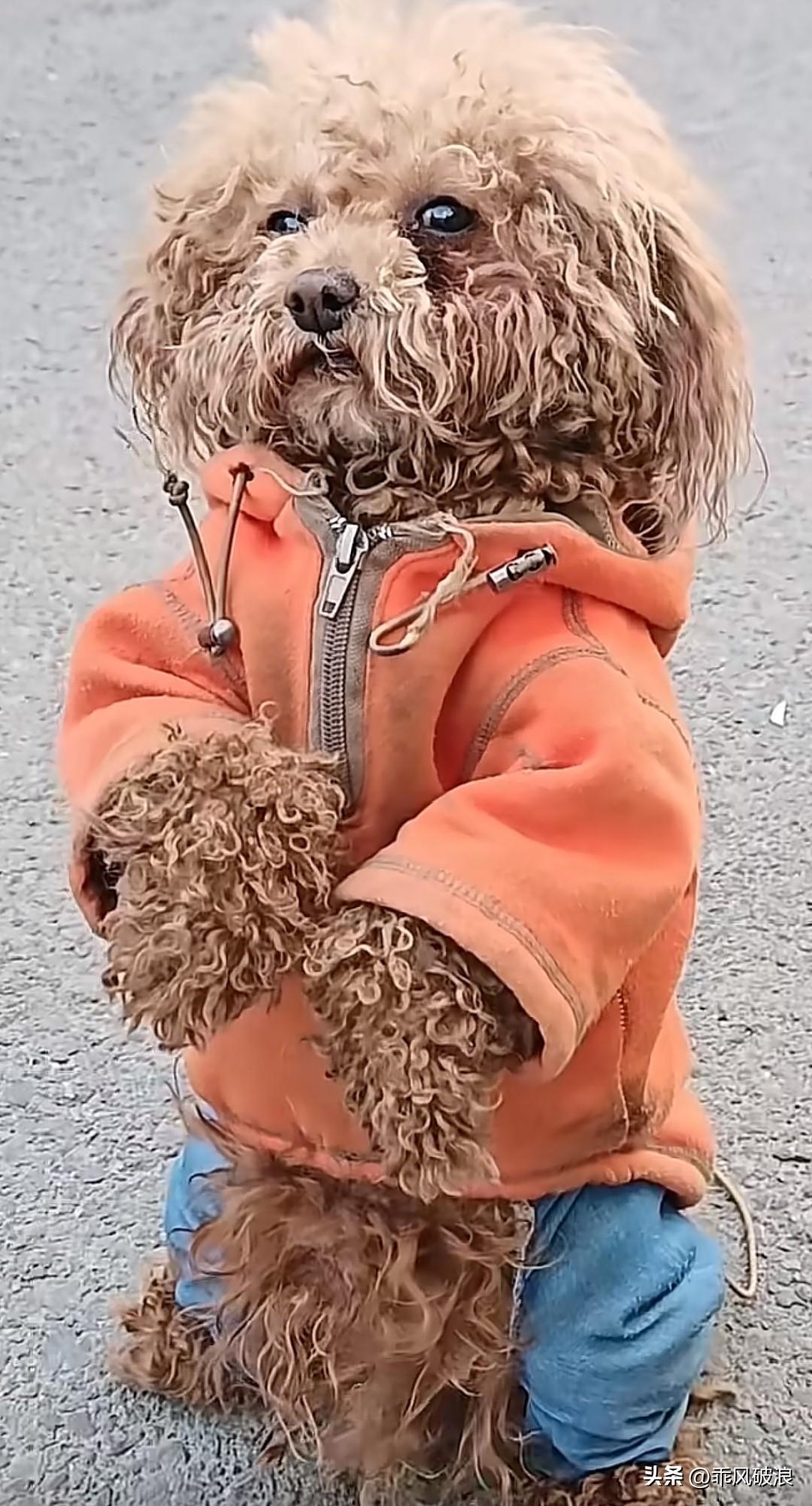 一只不知被何人遗弃的泰迪狗,身上穿着衣服,如今已脏得油光发亮,毛发长得缠结在一起。它逢人便站立起来讨要食物,看样子被抛弃至少已有半年之久。棕色泰迪犬 泰迪流浪犬