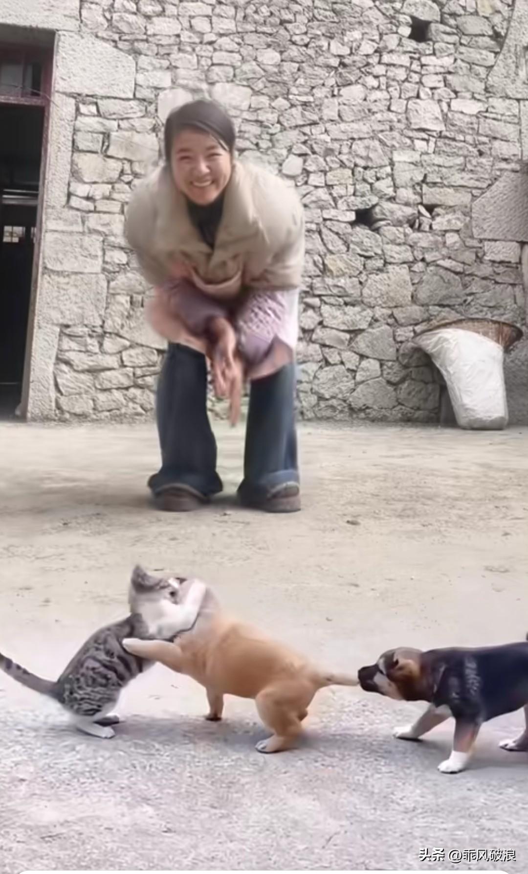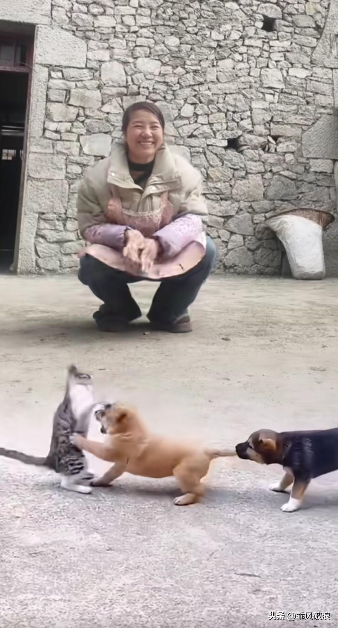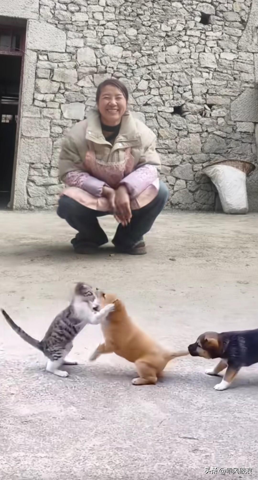 猫咪和小狗正在打闹,小狗的兄弟不仅不帮自家伙伴,反而帮着猫咪,在后面咬住我的尾巴往后拉。主人看到它们像小孩子一样打架,蹲下身子哈哈大笑。猫狗搞笑对峙 情侣猫打架