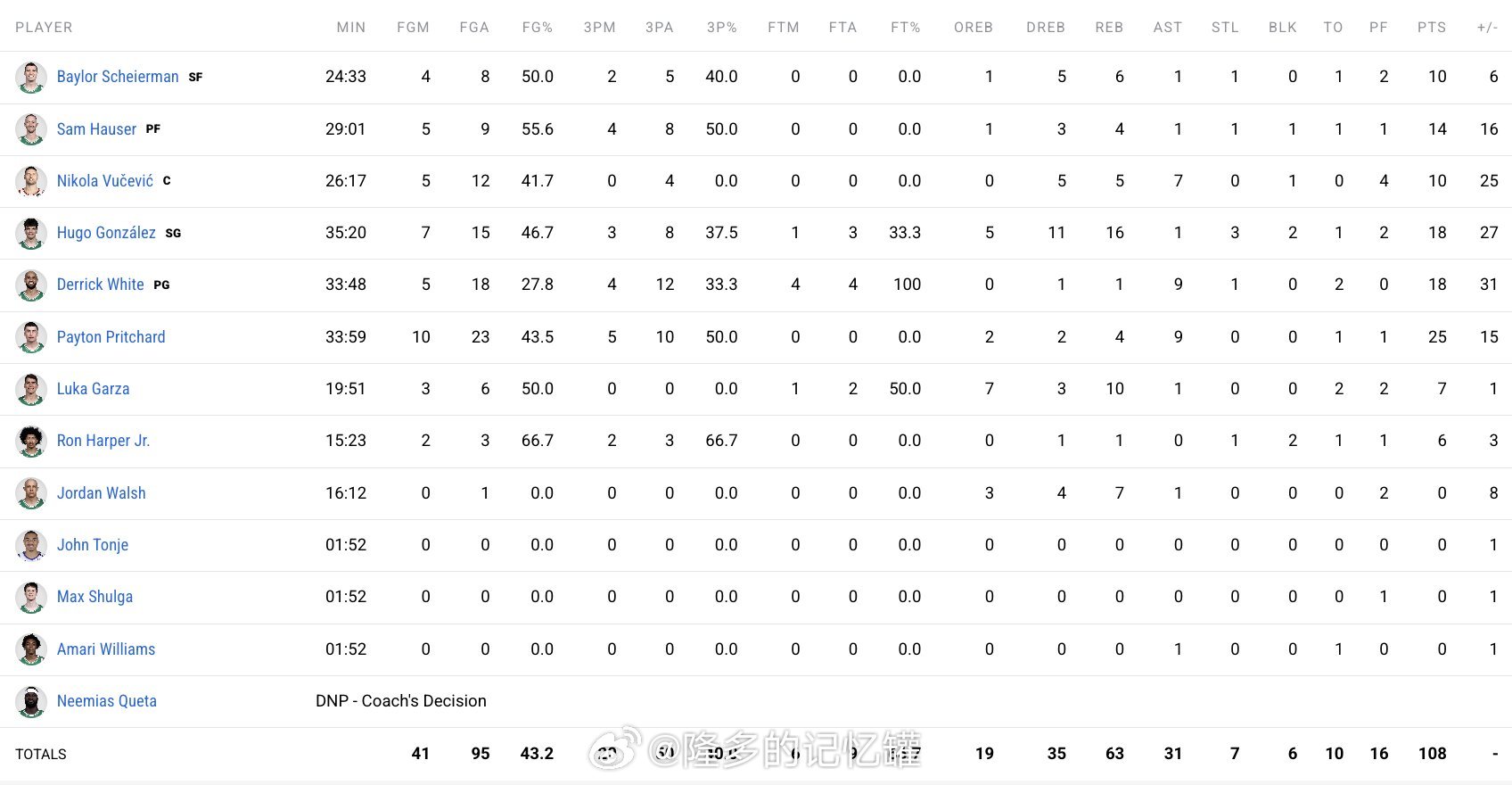 佩顿-普里查德25分4篮板9助攻德里克-怀特18分9助攻尼古拉-武切维奇10分5篮板7助攻萨姆-豪瑟14分4篮板贝勒-沙伊尔曼10分6篮板雨果-冈萨雷斯18分16篮板3抢断2盖帽卢卡-加尔扎7分10篮板1助攻小罗恩-哈珀6分1篮板2盖帽乔丹-沃尔什7篮板1助攻