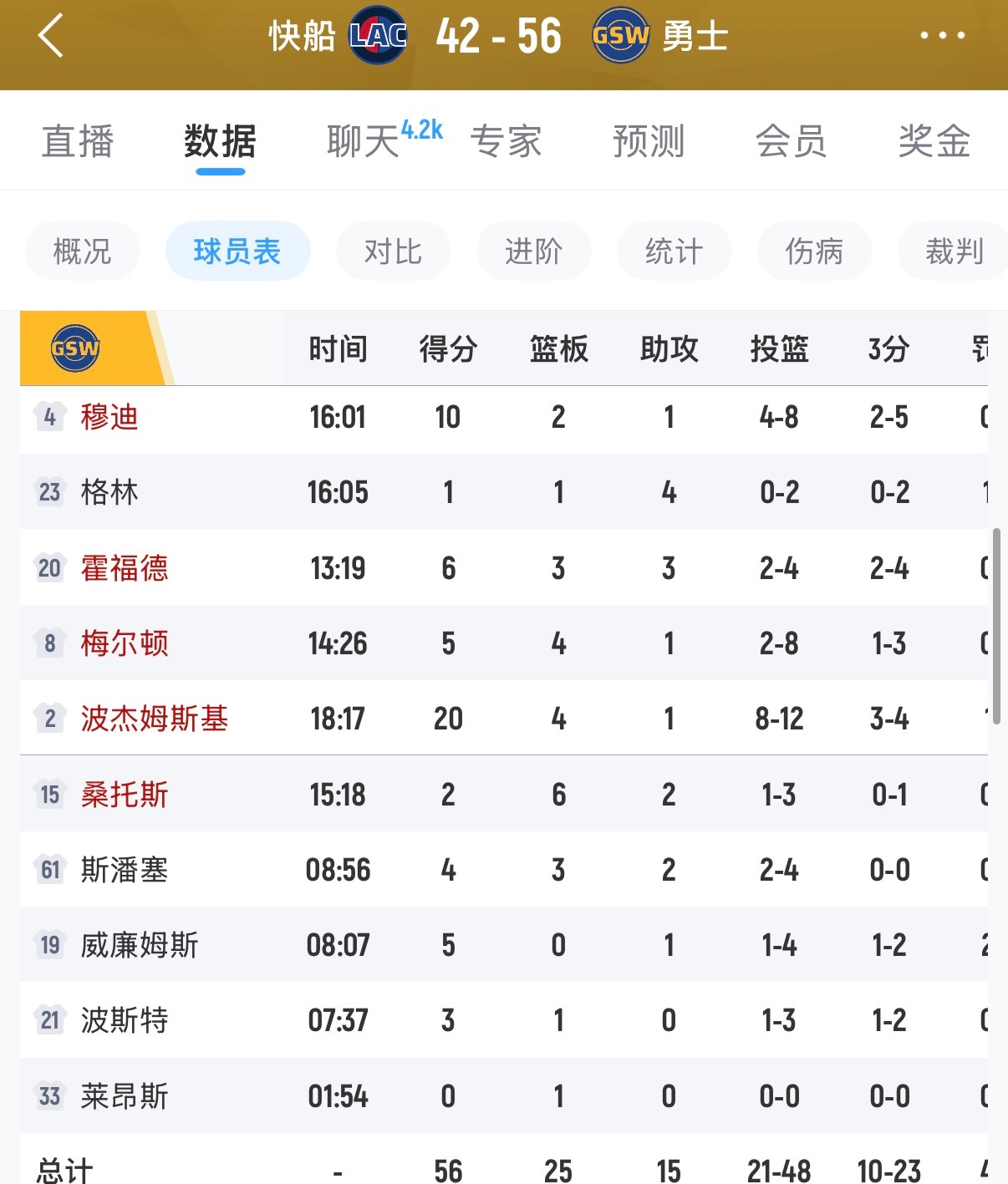 勇士队以56-42领先进入中场休息,将快船队的投篮命中率限制在37.2%,并迫使对手出现9次失误,得到14分。全队拼尽全力。波姐今天真猛12投8中得到20分。穆迪得到10分。伦纳德得到8分,怎么感觉今天会被逆转呢?