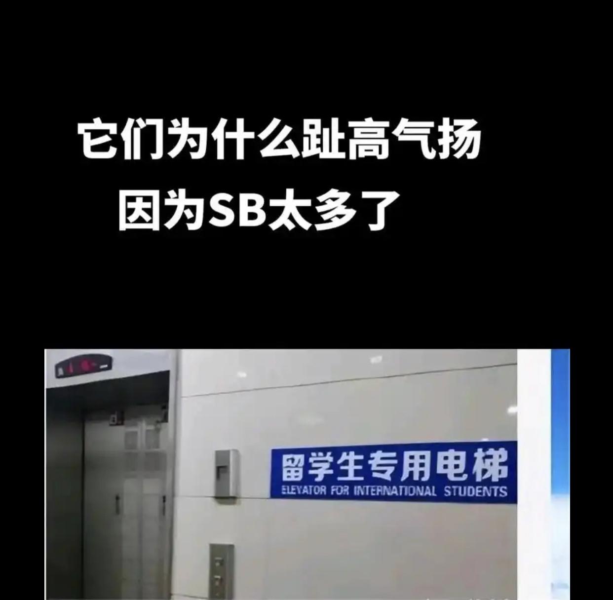 国内某大学里的电梯旁贴着中英文“留学生专用电梯“七个大字,意思是这座电梯只有在大学里的外国留学生可以使用,中国学生则禁止使用,中国的大学为啥要歧视中国人呢?难怪有些来中国学习的外国留学生如此的趾高气昂、态度傲慢,有的留学生甚至还能有不低的奖学金收入。