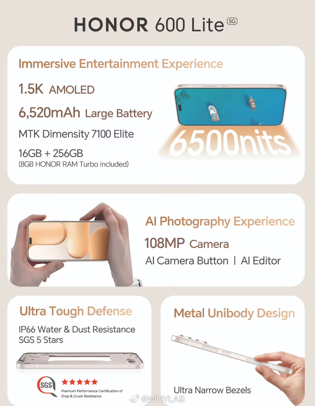 荣耀 600 Lite,国内应该是叫 X80i,果味很足,搭载天玑 7100,1.5K AMOLED 屏幕,峰值亮度 6500nits,6520mAh 电池,1.08 亿主摄,金属中框,支持 IP66 防尘防水,通过 SGS 五星级认证。