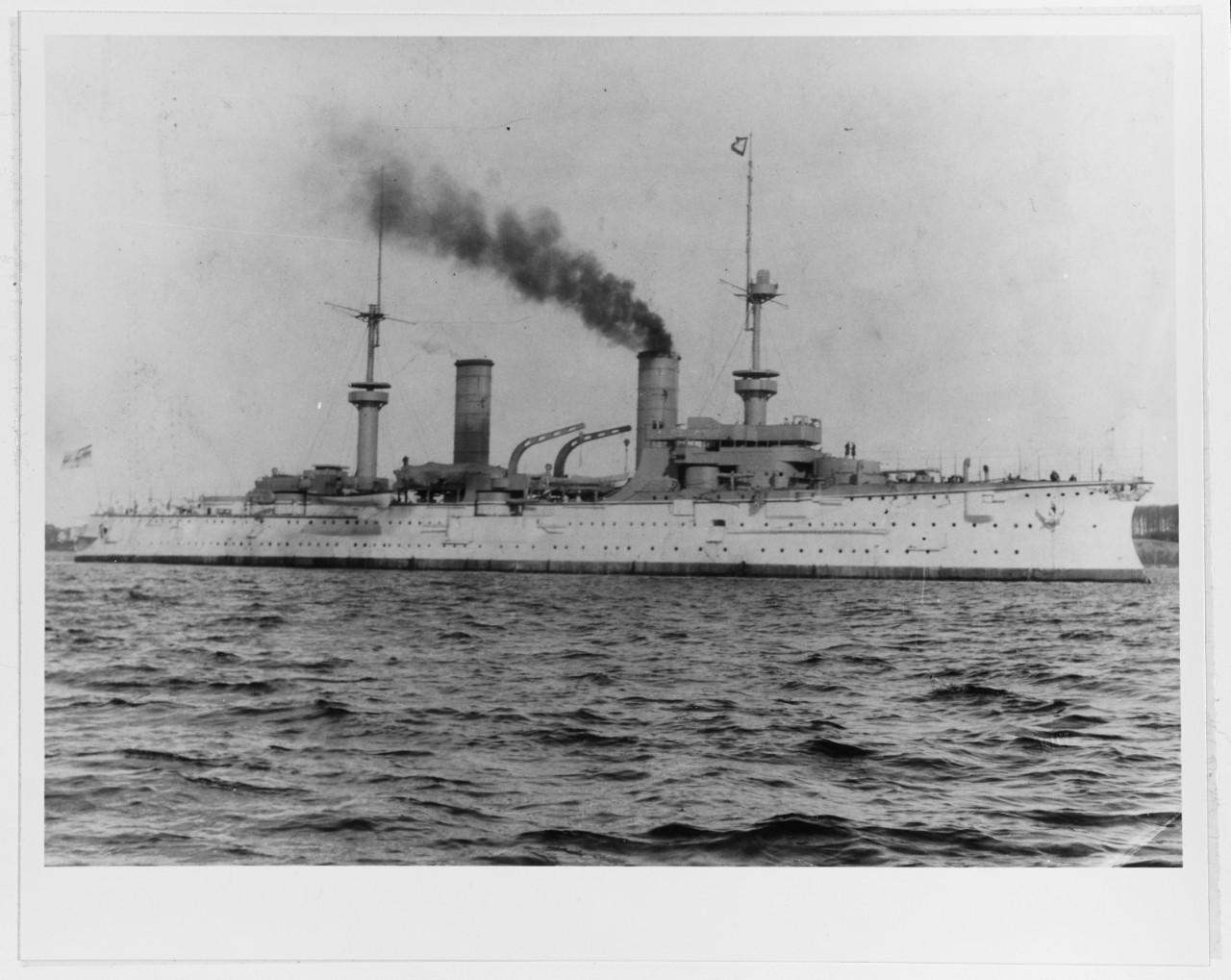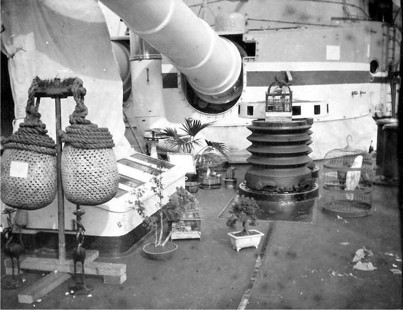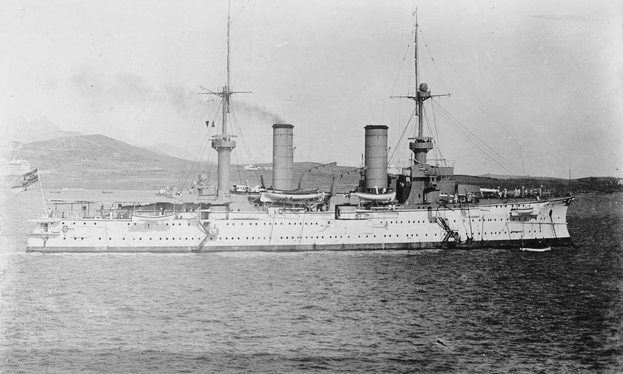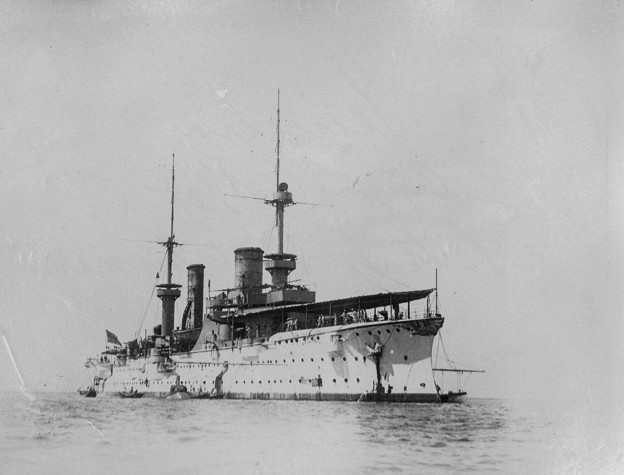 在青岛的“俾斯麦亲王”号装甲巡洋舰 “俾斯麦亲王”号装甲巡洋舰1896年下水,1900年6月30日离开基尔港,前往东亚,于8月13日抵达青岛,成为德国海军东亚分舰队的旗舰。1900年10月5日,“俾斯麦亲王”号启航前往大沽,参加了八国联军对中国的战争。 该舰全长127.11米,最大宽度20.42米,吃水8.46米,标准排水量达10690吨,满载排水量11461吨,是德国海军第一艘万吨级的大型巡洋舰,以铁血宰相俾斯麦的名字命名。 该舰装备了4门240毫米40倍口径主炮,分别安装在2座双联装炮塔中;12门150毫米40倍口径主炮对称分布在船舷两侧;上层建筑两侧安装10门88毫米30倍口径速射炮,另外装备了6具450毫米鱼雷发射管。