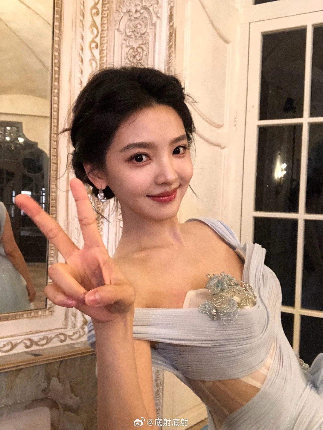 章若楠直播蓝裙盘发造型,公主这个直播镜头美成啥了🤤