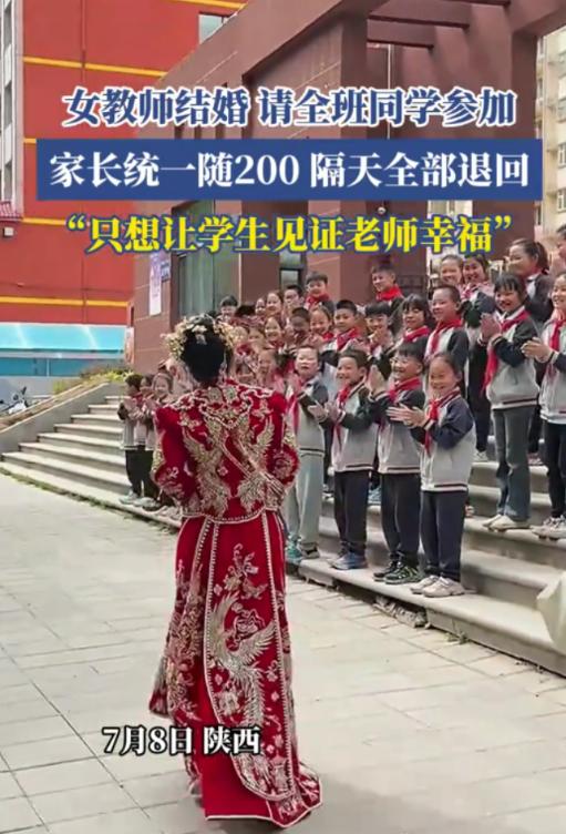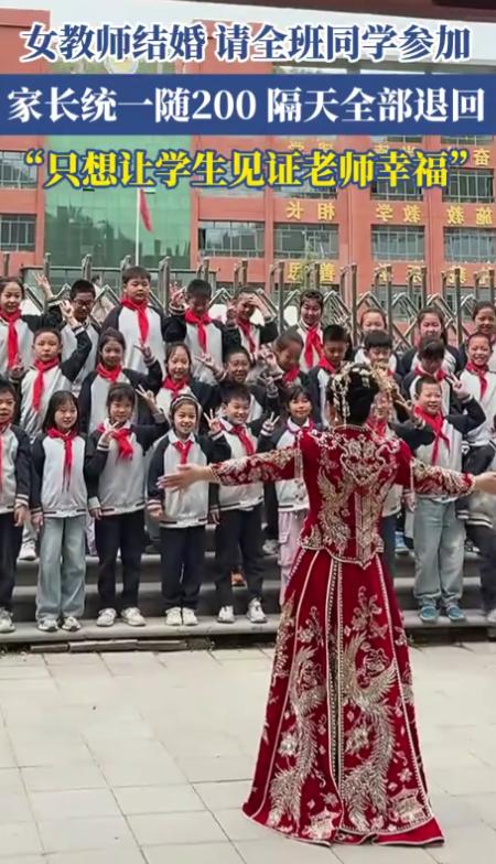如今不少家长都在为师生间的人情往来犯愁, 随礼怕违规,不随又担心孩子被区别对待, 原本纯粹的师生关系,慢慢多了不少负担。 而陕西一位小学女老师的婚礼, 却在网上火出了不一样的画风。 没有复杂应酬,没有功利往来, 只用一个举动,赢得无数人点赞。 这位老师在结婚前, 向班里的小学生发出了邀请, 希望孩子们能到场见证自己的幸福时刻。 消息传开后,家长们也表示支持。 按照当地的人情习俗, 家长们经过商量,统一为孩子准备了200元礼金, 当作一份普通的祝福,不攀比、不铺张。 婚礼当天,孩子们来到现场, 送上自己的祝福与心意。 整个过程简单温馨,氛围轻松融洽。谁也没有想到,婚礼结束后的第二天, 老师做出了一个让人意外又暖心的决定。 她将所有家长随的礼金,全部原封不动退还。 从一开始,她就没有收取礼金的想法, 邀请孩子,只是单纯分享幸福, 并非借机敛财,更不是增加家长负担。 这一退,退回的是金钱, 守住的却是师德底线, 也让很多家长放下了心里的顾虑。 近年来,教育部门多次强调师德师风建设, 严禁教师违规收受礼品礼金, 减轻家长压力,维护教育公平。 这位老师的做法, 正好契合了清廉从教的要求, 用实际行动划清了公私界限。 事件在网络传播后,引发广泛讨论。 不少网友表示,这样的师生关系才最舒服, 简单、真诚、没有压力。 大家称赞老师有分寸、有底线, 也感慨能遇到这样的老师,是孩子的幸运。 在人情容易变味的当下,这份纯粹格外难得。 真正的教育,从来不止在课堂之上。 老师的一言一行,都会成为孩子的榜样。 这场特殊的婚礼,就是一堂生动的成长课。 它告诉孩子们,祝福可以很简单, 真诚比金钱更珍贵, 善意比形式更动人。 没有炒作,没有剧本,没有夸大, 一件小事,却传递出最踏实的正能量。 干净的关系,真诚的心意, 这才是师生之间最该有的模样。 信源:中国经济网 《教师结婚不宜让全班学生当“见证人”》