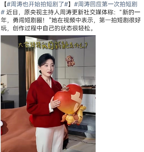 知名前央视主持人周涛冲上了热搜,57岁的她居然官宣“勇闯短剧圈”!她还直言拍短剧的过程轻松又好玩。 其实这不是周涛的首次突破,离开央视一线后,她转战北京演艺集团、保利文化集团,还跨界演话剧、拍电视剧,2024年与张国立搭档《老家伙》的演技就获老戏骨点赞。