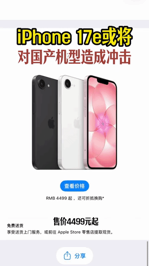 iPhone17e或将对国产机型造成冲击别再觉得苹果高高在上了,这次iPhone17e直接用价格说话。国补后直接3开头说话,轻松进入大众消费区间,而且加量不加价不是口号,是真的在抢市场!这下消费者多了好选择,感觉市场要重新洗牌了!苹果新机已触碰到三千价位