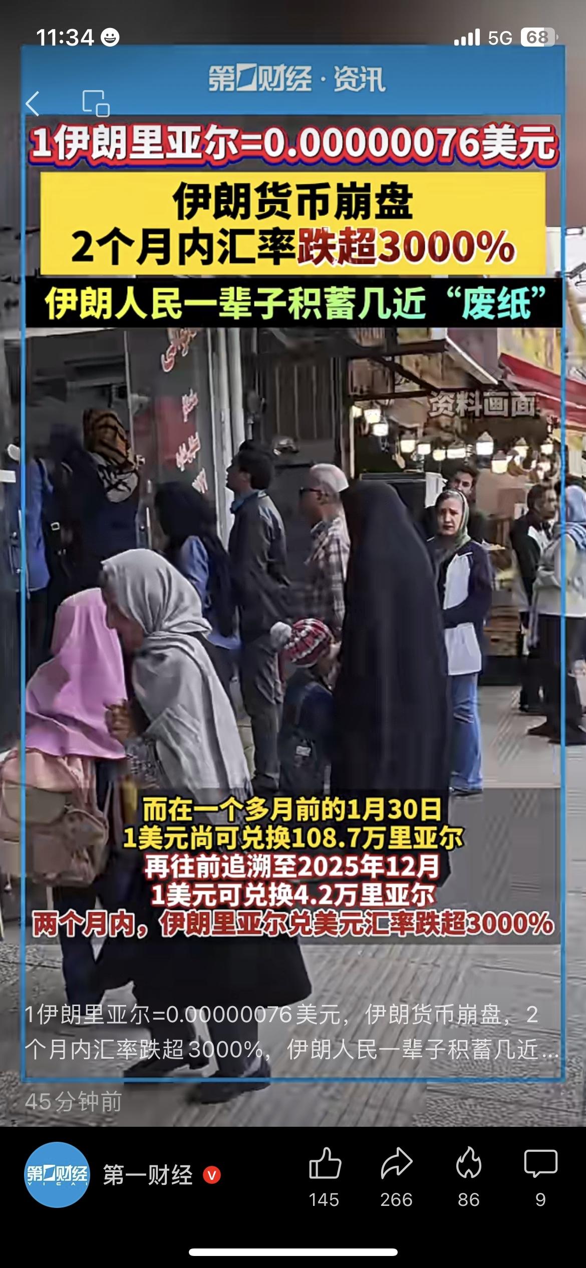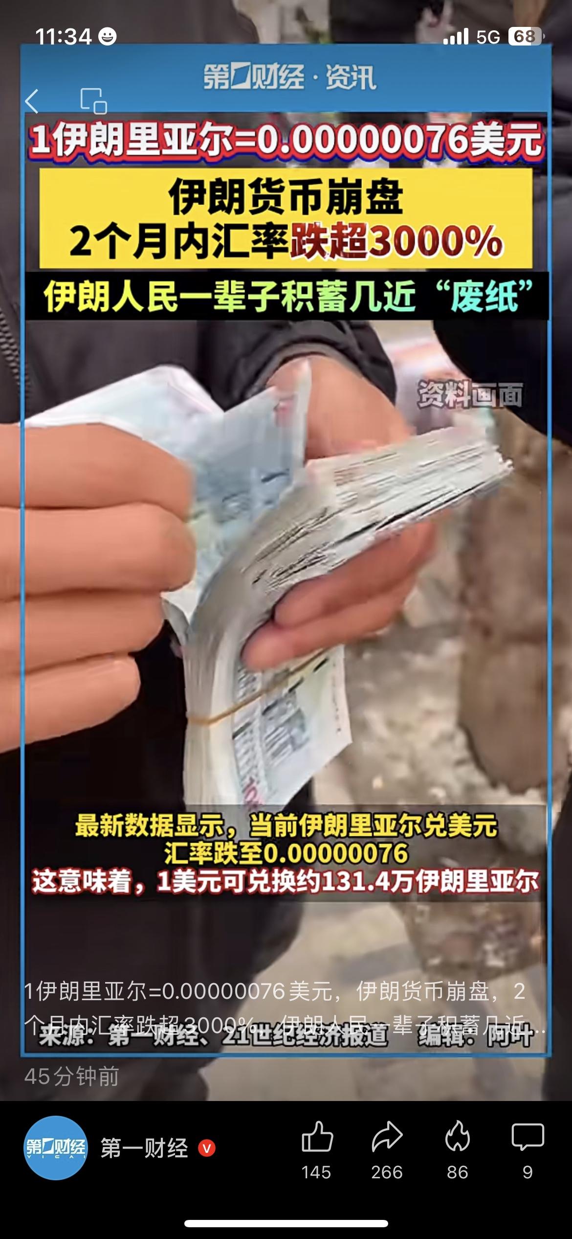 太惨了!伊朗货币崩盘,一辈子积蓄变成废纸 看到伊朗的新闻,我真的很感慨。 现在1伊朗里亚尔只能兑换0.00000076美元,短短两个月内,汇率跌幅超过3000%。很多伊朗人一辈子的积蓄,一夜之间变成了废纸。 按现在的汇率,普通伊朗人全职月薪只有100多美元,这点钱只够买基本的食品。 说白了,这就是制裁下的民生悲剧。我刷到过一些视频,他们推着一车的钱去买面包,脸上写满了无奈。 我们生活在一个相对稳定的环境里,真的要好好珍惜。 你看完最大的感受是什么?评论区说一句。 伊朗货币崩盘 经济制裁 全球经济