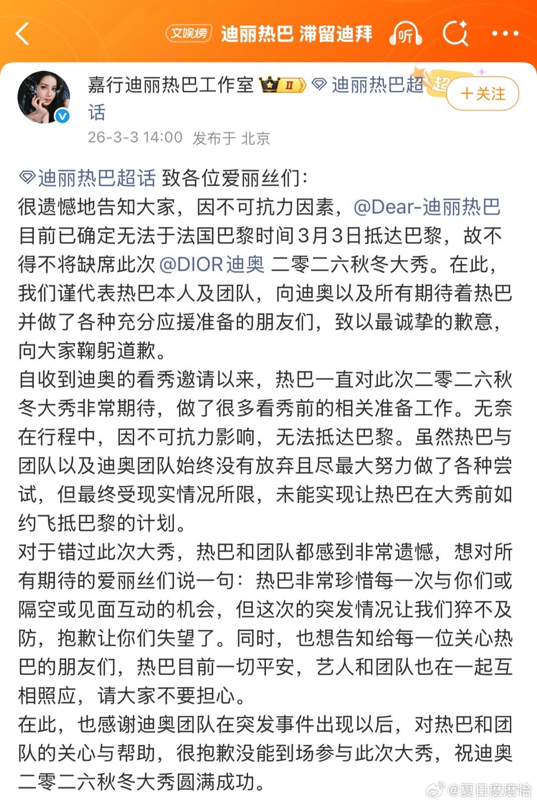 迪丽热巴 滞留迪拜 工作室发文迪丽热巴原定以Dior全球品牌大使身份出席巴黎时装周,因中东局势突变、阿联酋领空关闭,在迪拜中转时滞留超24小时,多方协调仍无法成行,确认缺席本次大秀。刷到消息心都揪紧了,看到工作室说平安才松一口气。秀不秀的不重要,人平安才是第一位!不可抗力谁都没办法,希望在异国好好的,盼早日顺利回国娱乐