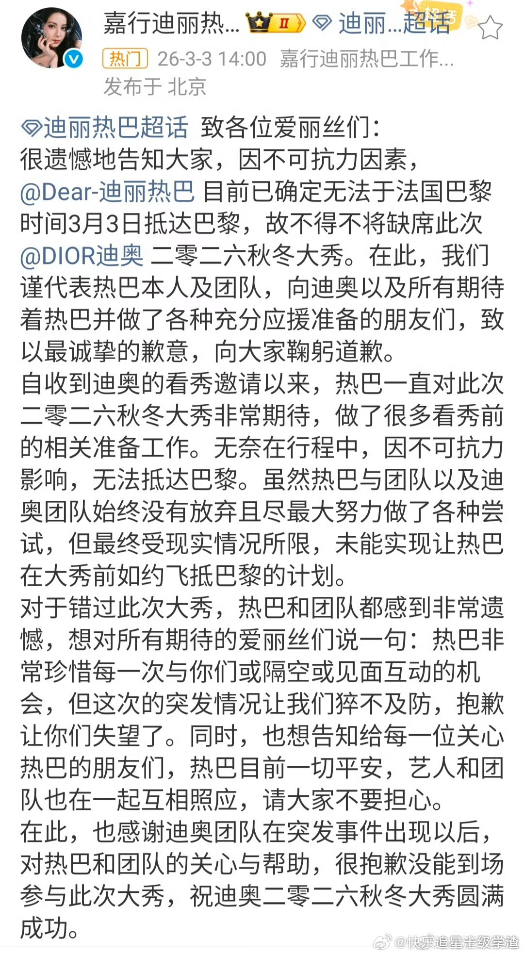 迪丽热巴将缺席时装周 安全最重要