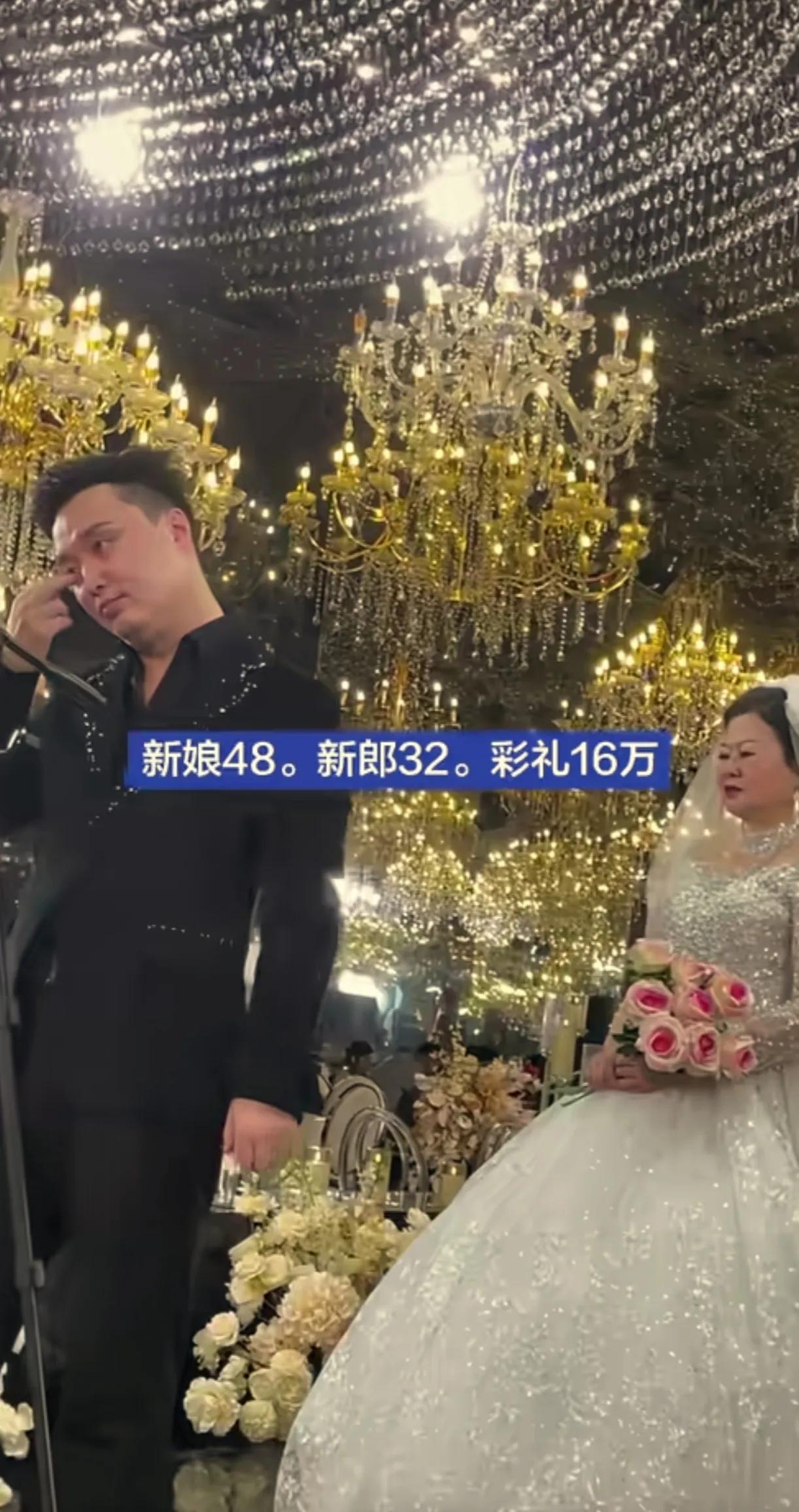 48岁的新娘一脸福相,表情严肃,32岁的新郎还没睡醒的表情,彩礼16万,隆重的婚礼,这是对新娘的重视。 祝福他们早生贵子,白头偕老。