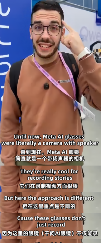 同时,另一个去探展的外国博主,体验千问AI眼镜后,更是感慨,Meta AI眼镜虽然在录制视频方面很棒,但是千问AI眼镜的重点是不同的,它不但能录,而且还会思考。