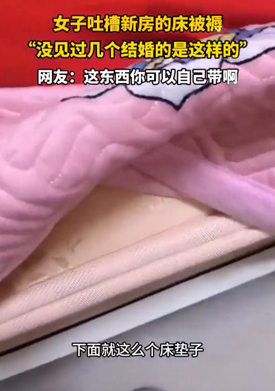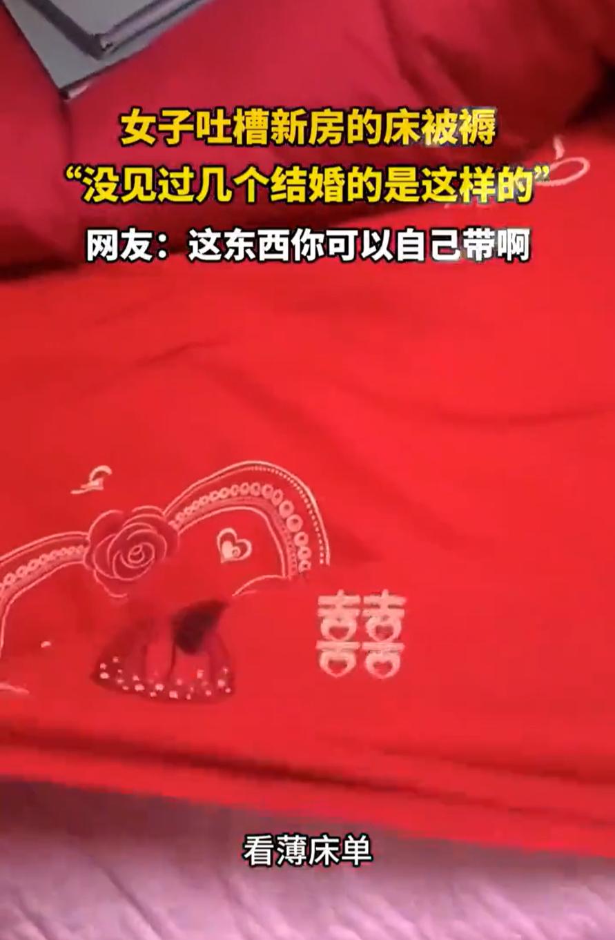 扎心了!一对新人结婚,结果晚上回到婚房,新娘就不高兴了,在网上吐槽婚床布置太奇葩,就只有一个薄薄的红色床单,但网友却表示:这东西你可以自己带啊! 按理说,结婚是大喜的日子,心情是相当高兴的,可新娘从回到新房就各种不满意,尤其吐槽自己的婚床布置太寒碜 视频中,一张大床上就铺了个薄薄的红色床单,下面直接就是床垫子。新娘边拍边念叨,你们瞅瞅,这就是我们结婚的床,就这么一层单子,下面啥也没有,谁家结婚弄成这样? 原本想着网友能跟着一起吐槽,没想到评论区翻了车 不少人直接说,这事儿真怪不着男方。床上那点事儿,本来就是女方家该操心的。被褥四件套这些,按老理儿都是娘家陪嫁带过来的。人家男方把床架子床垫子备齐了,剩下的就得你自己来 也有明白人说,这铺法没啥毛病啊。现在不都流行直接铺床垫上吗?又不是光板床,垫子软和着呢。再说现在谁家还像以前那样铺好几床厚褥子 说白了,结婚是两家人的事,但日子是两个人过。为这么个床单闹别扭,属实犯不上。往后柴米油盐的事儿多着呢,这点小事就想不开,以后咋整? 其实啊,婚床铺啥样不重要,重要的是睡在上面的两个人,能不能把日子过得热乎。床单薄了可以加,褥子软了可以换,这刚结婚就各种不满,恐怕以后得日子也是不太好过