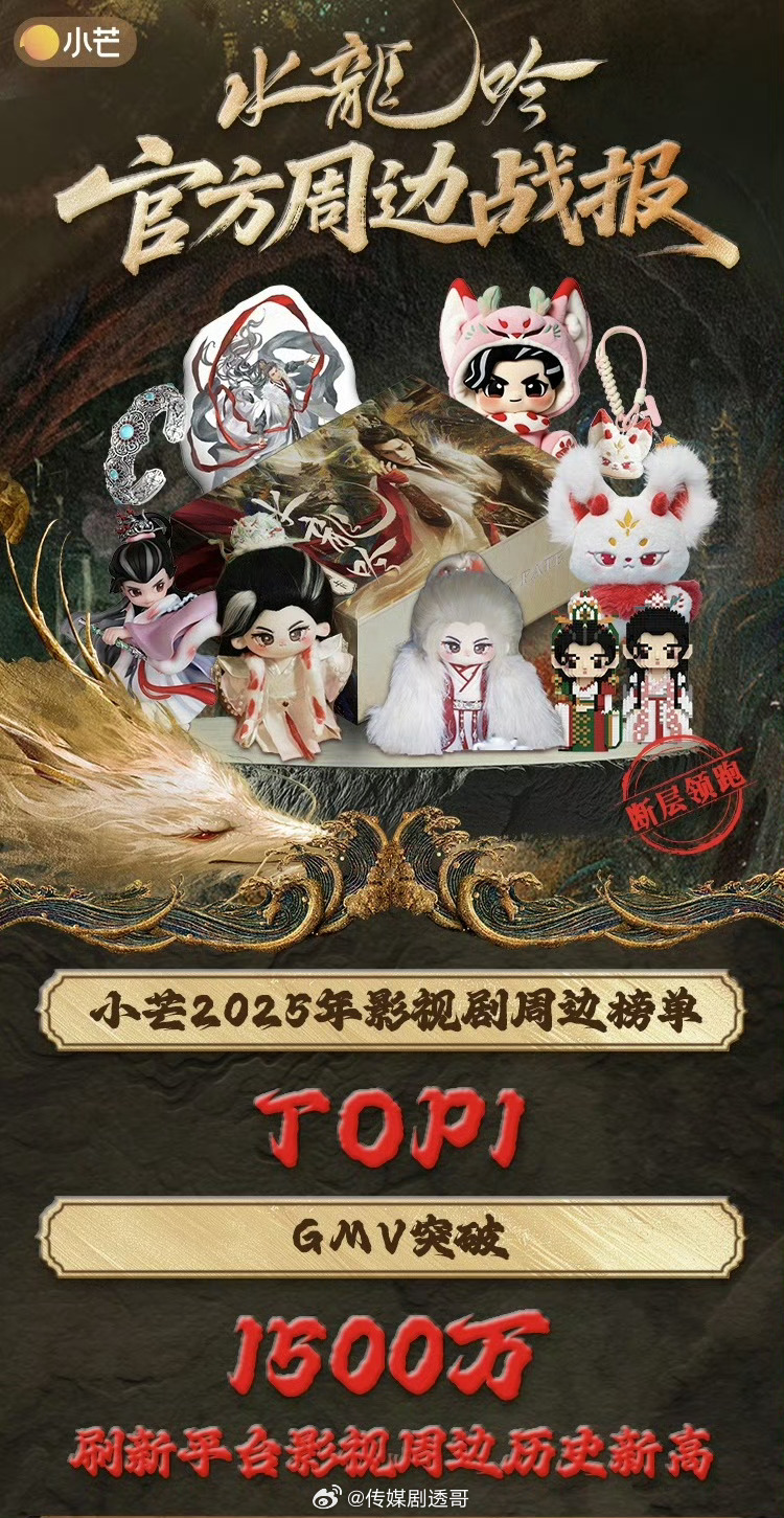 小芒-水龙吟周边战报1️⃣2025影视剧周边榜单TOP12️⃣️GMV突破1500w(交易总额)3️⃣罗云熙唐俪辞单人棉娃站内销量历史第一