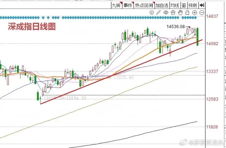 第二,今天上证指数虽然走出了实体大阴线,但整体来看,上证指数并没有形成非常清晰的技术破位。也就是说明天上证指数依然有可能在日线级别低点低点连线的支撑下,形成单日反弹的动作。并且今天上证指数底下还有30日均线的支撑。深圳成指今天大跌超3%。理论上来说,已经跌破近期低点低点连线的上升支撑线大家看图二。但是跌破的幅度并不深,而且在刚好跌破的情况下,如果第2天立即做修复的话,那也并不算是有效跌破。而且根据历史经验来看,但是往往这种突如其来的大阴线,隔天往往会迎来修复性的行情。