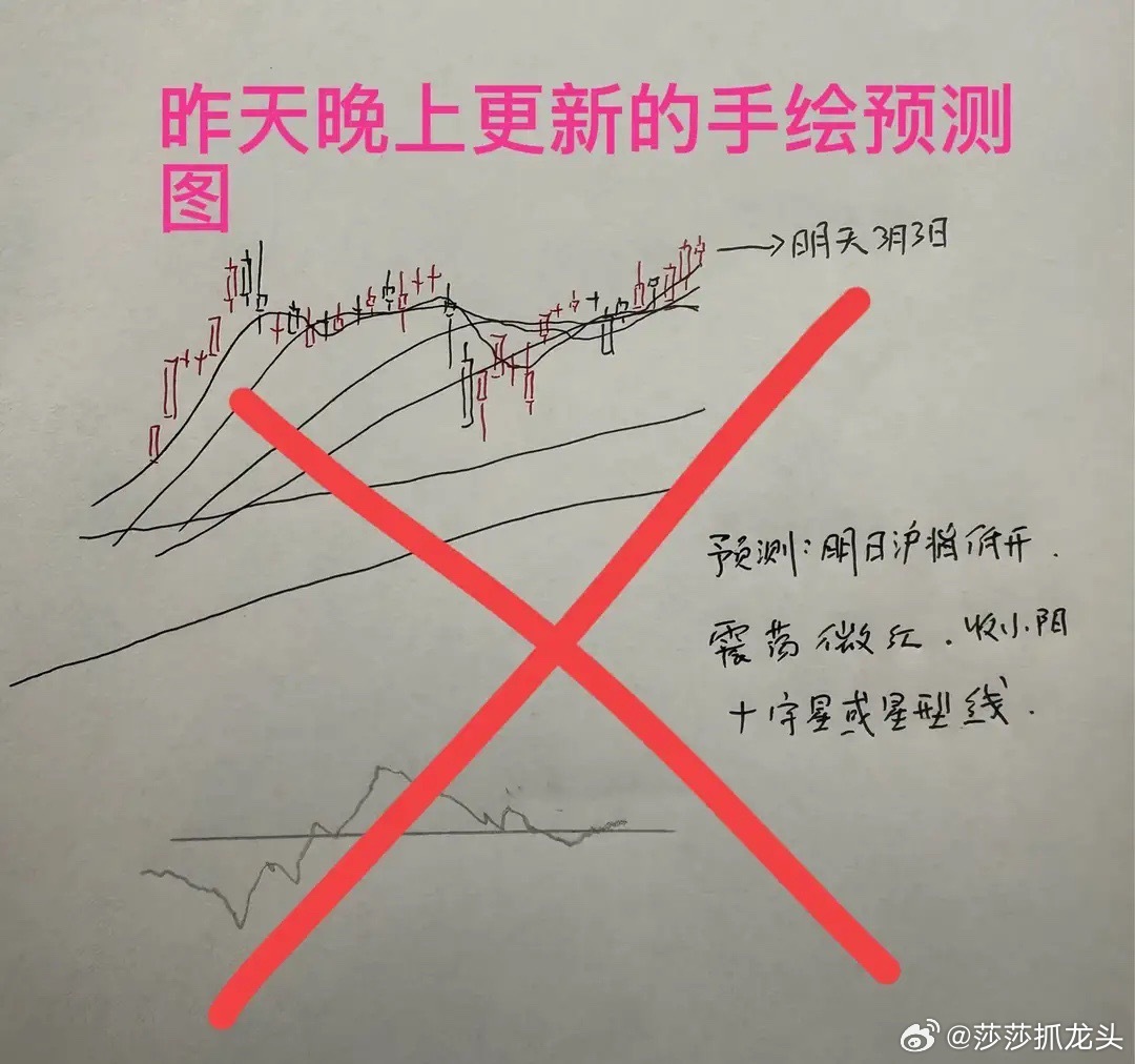 不得不说,对于市场走势的判断,确实有时候就是差之毫厘,谬之千里。对于市场的分析真的很难追求完美。因为市场的变量实在是太多了!其实今天A股早盘还出现了全线小幅高开的情况,今天如果消息面稳定,外围市场并没有出现大幅调整的话, A股市场走出一颗小幅度收涨的小阳线,概率还是非常大的。大家请看图五莎哥昨天更新的关于今天的手绘预测图。不得不说,我昨天的这个判断与市场的实际走势,可以说完全南辕北辙了。或者说被主力狠狠的狙击了。