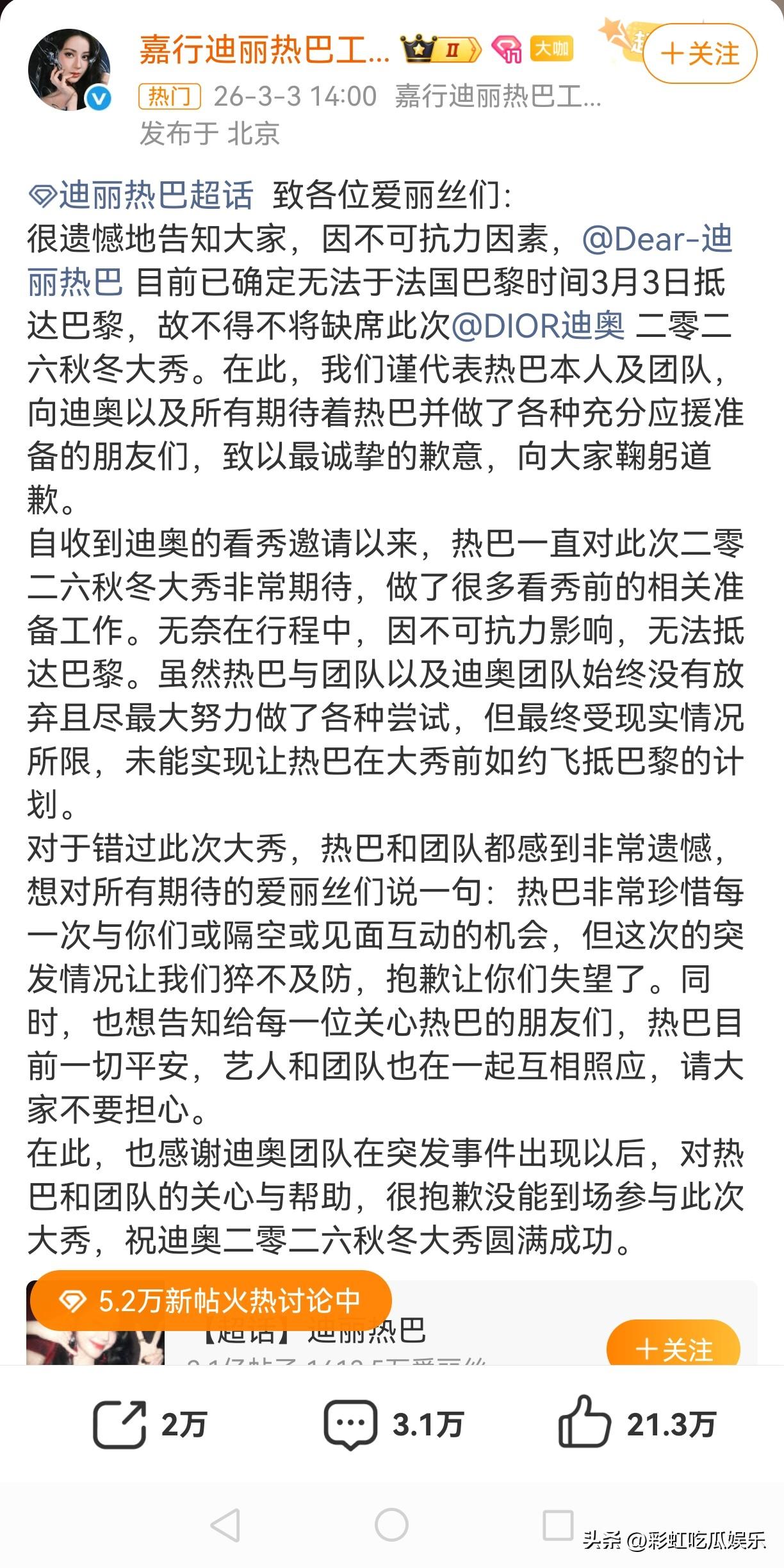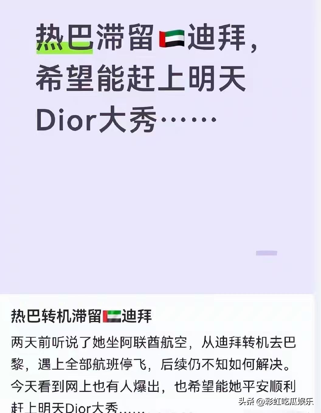 迪丽热巴太倒霉了,滞留迪拜机场赶不上明天到迪奥大秀,工作室沉默,谁都不知道会发生什么。 现在的航班停飞,机场乱作一团,大量旅客都滞留,好几个明星都困在那里,周雨彤去迪拜过年,游泳度假有多爽,现在就有多后悔。 迪丽热巴是去转机的,没想到耽误了行程,是经纪公司没有安排好。不过工作室也报平安了,迪丽热巴没事,希望早日回来!