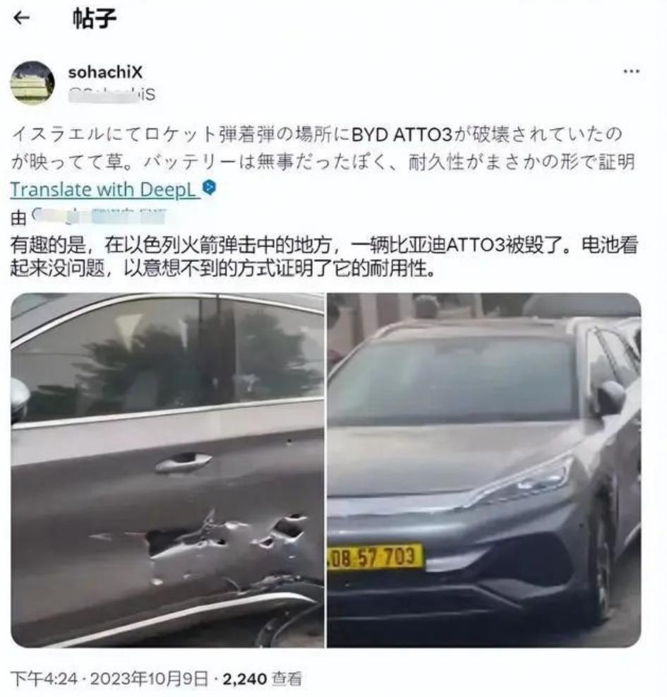 比亚迪元PLUS在中东近距离接触导弹爆炸,玻璃破损,车身也出现破损,但是整体框架依旧保持完整,乘员舱内没变形。 其实比亚迪元PLUS的车身安全在中东不是第一次了,以前就有国外博主爆料,一辆元PLUS被火箭弹弹片冲击,结果车内完好。 这一切无不诠释比亚迪车无愧公路坦克,有人在网上阴阳说比亚迪车之所以能降价,是因为偷工减料,然而事实却每次都打脸。,玻璃破损,车身也出现破损,但是整体框架依旧保持完整,乘员舱内没变形。 其实比亚迪元PLUS的车身安全在中东不是第一次了,以前就有国外博主爆料,一辆元PLUS被火箭弹弹片冲击,结果车内完好。 这一切无不诠释比亚迪车无愧公路坦克,有人在网上阴阳说比亚迪车之所以能降价,是因为偷工减料,然而事实却每次都打脸。