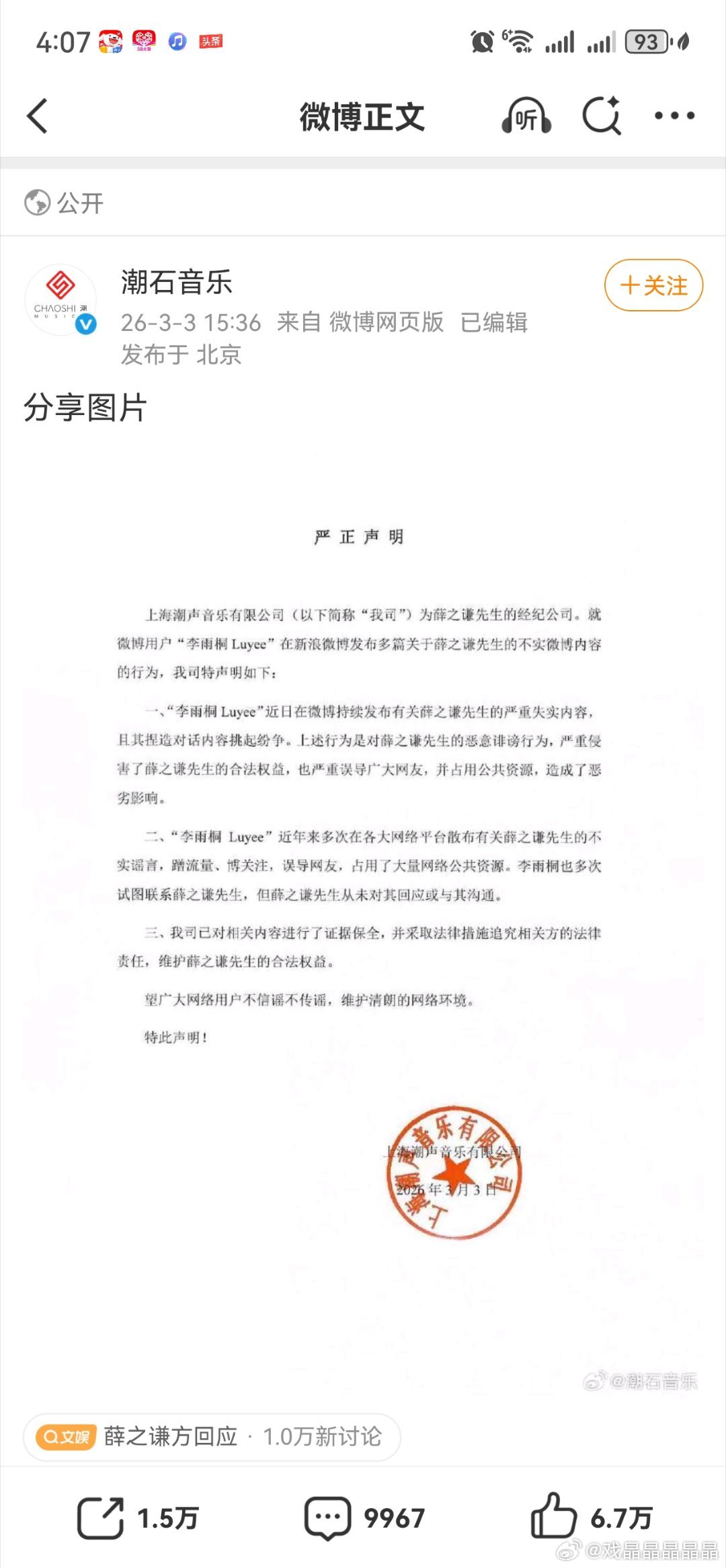 薛之谦的公司潮声音乐就李雨桐的微博用北京潮石音乐账号发布了公开声明。北京潮石的二股东是薛之谦的父亲。潮声音乐是潮石音乐100%控股的子公司。
