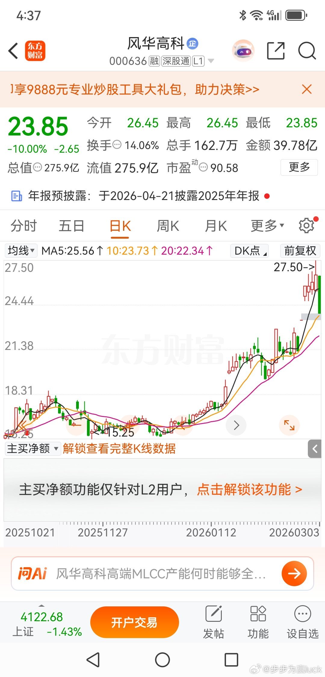 风华高科,进攻阴线已出风华高科,股市风云变化,昨天还雄赳赳气昂昂,今天就倾盆大雨。连续两个一字涨停,后强势震荡三天,每天盘内都有新高。今天上午有群友问我,这个票怎么处理,我的意见是赶紧跑,但我不知道他是否跑掉了。风华高科,早盘五分钟下跌了6%,这个不是什么调整的信号,杀跌坚决,这是一个变盘信号。风华高科,是否会连续下跌,这个不好判断,因为封单还是不算大的。还在里面的朋友,如果明天有反弹,你要坚决离场,如果直接杀,你就自认倒霉,但千万别补仓。欢迎加入我们的免费交流群财经股票