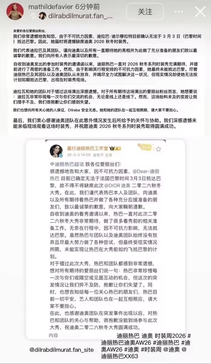 迪奥全球公关总监发文迪奥全球公关总监发文回应了迪丽热巴缺席时装周,期待热巴早日回国迪奥全球公关总监回应迪丽热巴缺席迪丽热巴 滞留迪拜
