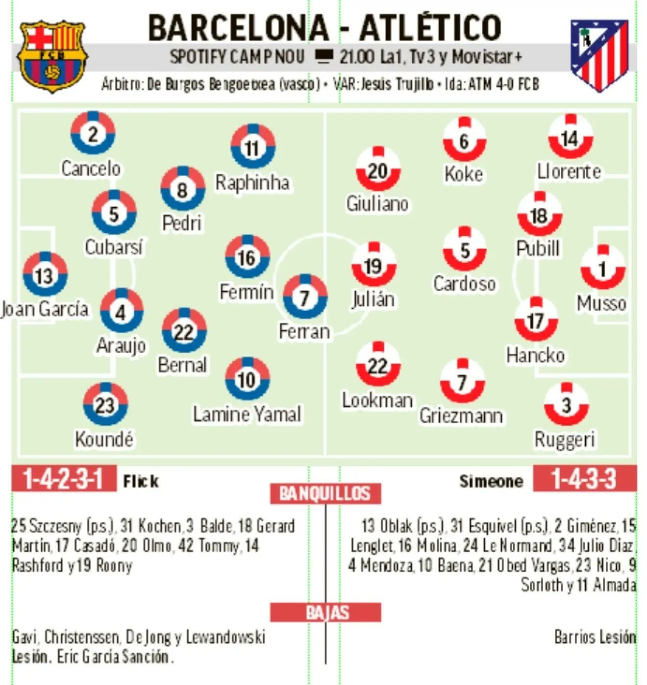 媒体预测巴萨VS马竞首发阵容🔥🔥🔥🔥🔥🔥🔥🔥🔥🔥🔥巴萨vs
