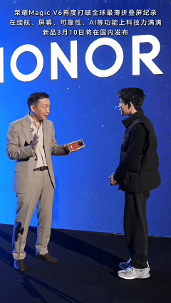 何同学说荣耀MagicV6确实非常不错 在MWC展会的荣耀展台,何同学对荣耀Magic V6的“确实非常不错”评价,是对其硬核堆料的最佳注脚。这款手机搭载满血第五代骁龙8至尊芯片,性能处于行业第一梯队;同时利用32%硅含量的青海湖电池技术,实现了7000mAh+的超大容量与全球最薄机身的完美平衡,续航能力直接对标直板旗舰。此外,其AI会议助手大大提升了日常工作效率,加上IP68&IP69的顶级防水能力,荣耀Magic V6简直无可挑剔,何同学的认可实至名归。