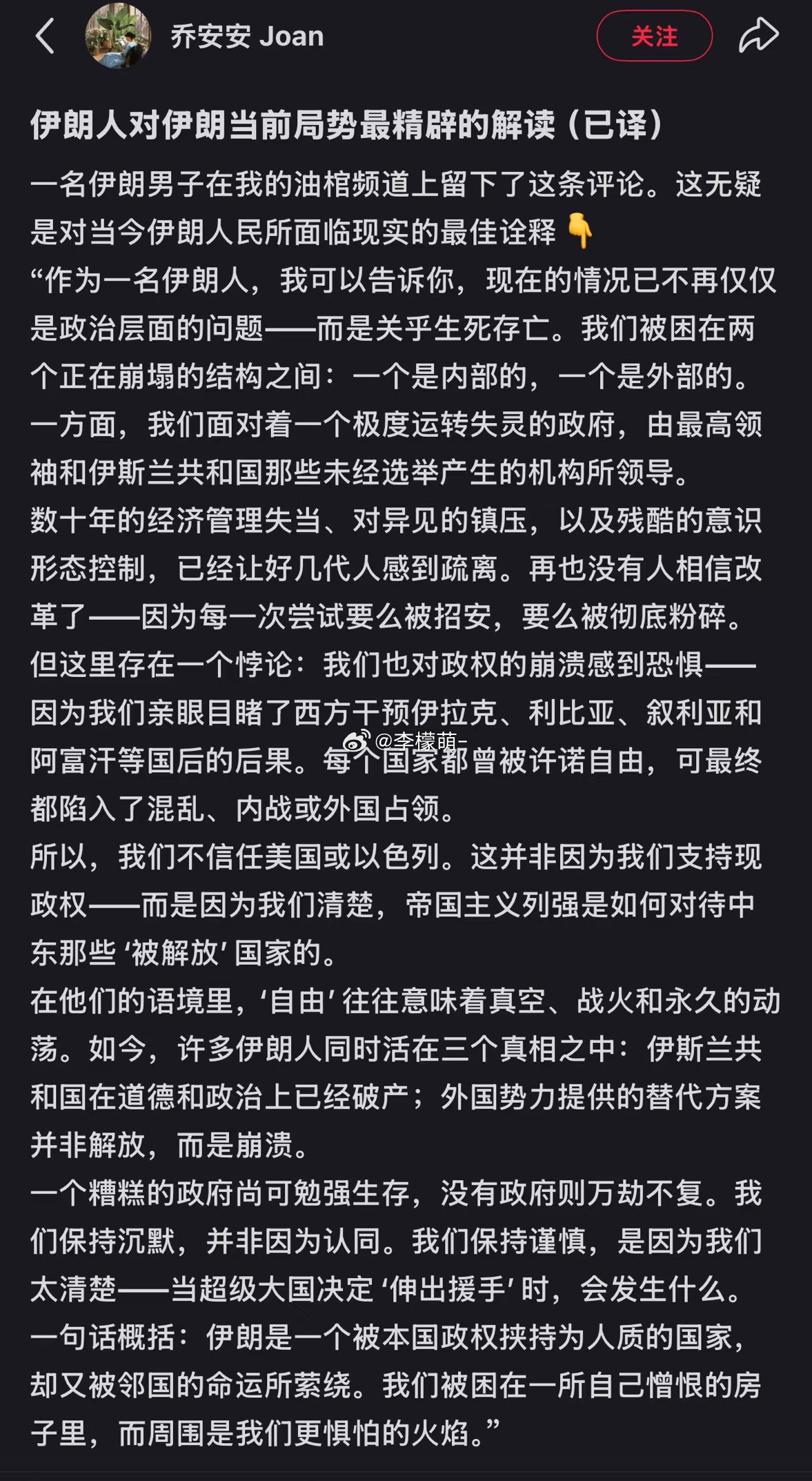 这段来自伊朗民众的自述,道出了在夹缝中生存的极致无力感,一种“双重绝望”…“被困在一所自己憎恨的房子里,而周围是他们更惧怕的火焰”——这句话是对当下中东困境最残酷的注脚。