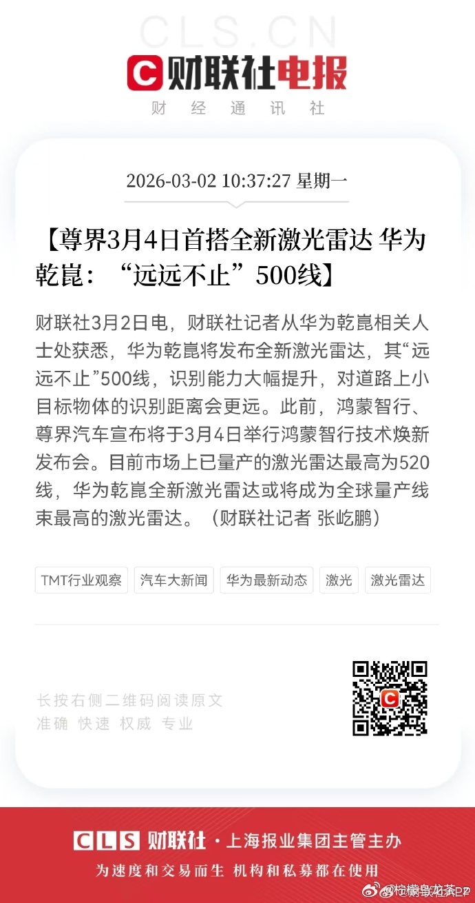 3月4日鸿蒙智行技术焕新发布会 ,目前官方信息里最硬核的看点,就是500 线激光雷达正式量产上车,尊界S800和问界M9 将首发!更高的感知精度、更强的雨雾 / 逆光 / 夜间识别能力,是智能驾驶底层硬件的一次实打实升级。除此之外,座舱、车云,底盘,电池应该也都会有更新,期待一波!鸿蒙智行 华为