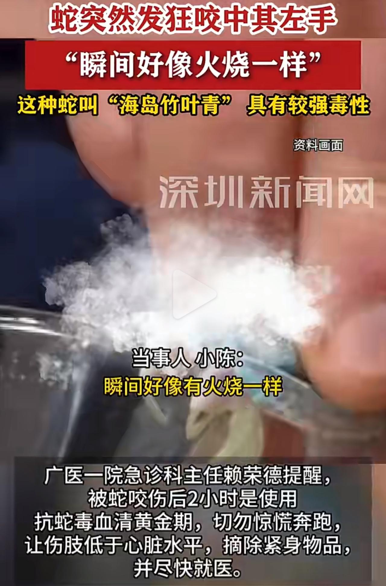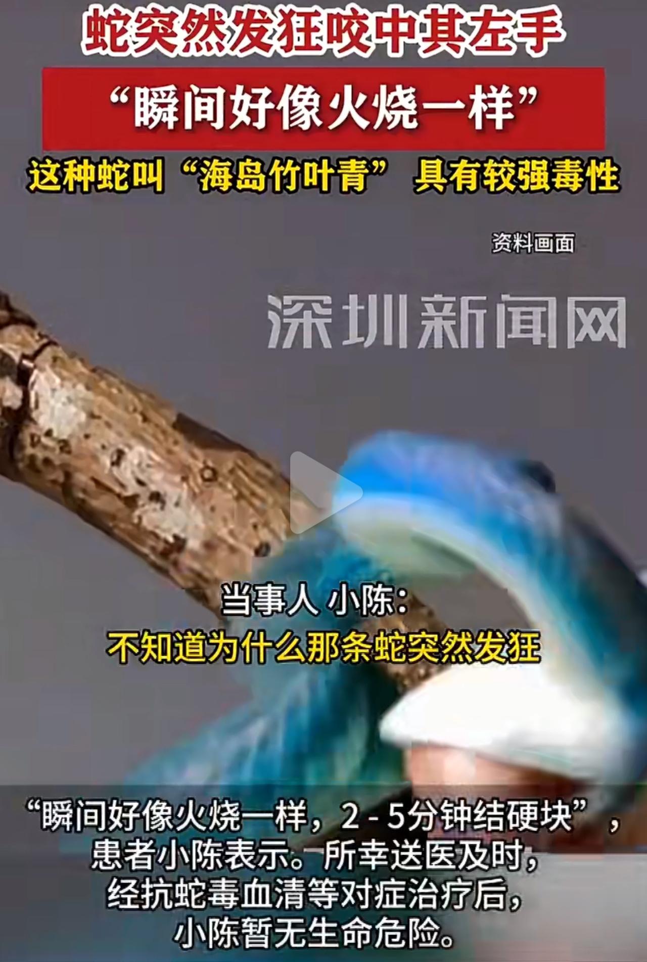 广东一个小伙子去朋友家,凑近拍那条剧毒的海岛竹叶青吃东西,想拍个惊险视频,结果蛇突然一口,狠狠咬在了他左手上。 当时伤口就跟火烧似的疼,没几分钟就肿得又硬又黑,皮下全是淤血。这种外来毒蛇毒性特别烈,专门破坏凝血和血管,晚送医一会儿,都可能组织坏死,甚至危及生命。 小伙还算冷静,自己赶紧开车去医院,医生及时打上抗蝮蛇血清,这才捡回一条命。 最让人后怕的是,这种剧毒蛇居然能私人随便养,还能通过快递偷偷运输,真出了事,连对应的血清都不一定有。 很多人就觉得异宠帅、小众、有面子,可忘了冷血动物根本养不熟,尤其是进食、蜕皮的时候,攻击性极强,说咬就咬。 真心劝大家一句,爱好可以特别,但别拿命去赌。别等出事了才后悔,一时好奇,真可能换来一辈子的伤。 命只有一条,远离剧毒异宠,才是最实在的平安。薄荷竹叶青蛇 毒蛇咬伤中毒 异宠蛇