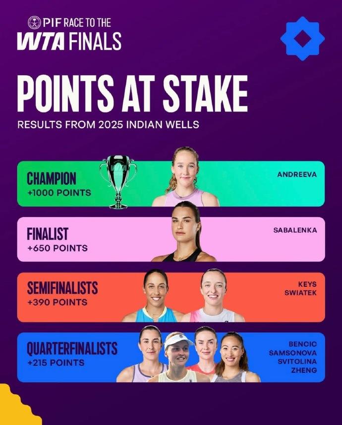印第安维尔斯站成绩不及上届,看看有谁会被扣分 北美阳光双赛之一的印第安维尔斯站马上就要开始了。有人在摩拳擦掌,期待在本站拿到好成绩;有人则可能忧心忡忡,担心成绩不如上届,被扣分,排名还要下滑。 这些人有: 上届冠军:安德烈耶娃,如果不能卫冕,肯定要扣掉1000分; 上届亚军:萨巴伦卡,如果成绩低于亚军,则要扣掉650分; 上届四强:凯斯和斯瓦泰克,如果不能打进四强,则要扣掉390分; 上届八强:本西奇、萨姆索诺娃、斯维托丽娜和郑钦文,如果不能打进八强,则要被扣215分。 当然,上述人等的最终积分,还要加上她们在本届比赛中所获成绩对应的积分。如果成绩超过了上届,肯定要加分的,排名还能够进一步提升。 本届比赛,看好萨巴伦卡、高芙、斯维托丽娜、斯瓦泰克、姆博科和约维奇等人。