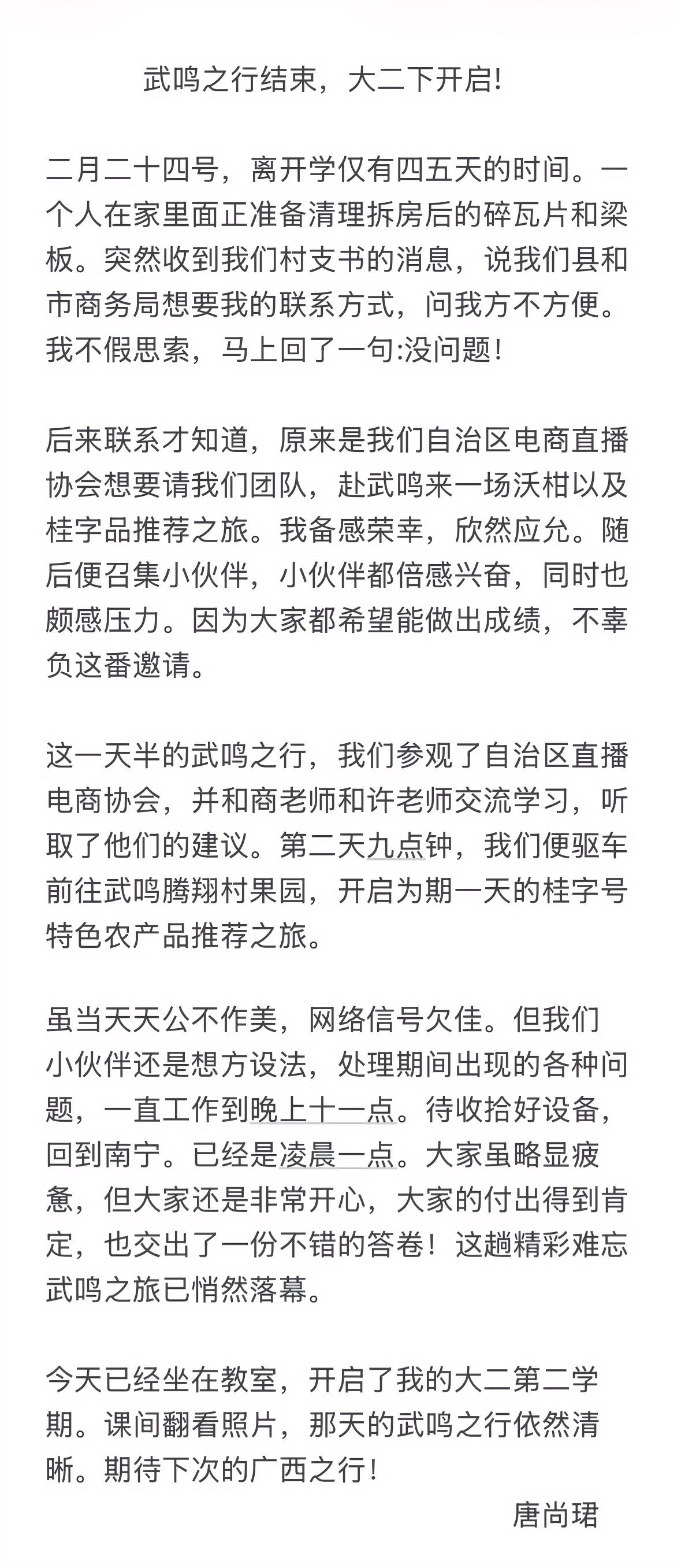 唐尚珺名气与影响力在变大,原来前两天的武鸣直播卖沃柑是受本区电商直播协会邀请推荐广西农产品。 唐尚珺接到邀请电话赶紧召集自己的朋友赴武鸣来一场沃柑以及桂字品推荐直播活动,克服网络不好困难从白天一直直播到晚上十一点,并交出了一份不错的答卷。 从复读15年的高中生到自己赚钱盖新房,唐尚珺名气越来越让更多人所知,如今唐尚珺和网红小徐一样将来会接到更多的助农活动。 现在唐尚珺已回到学校上课,进入大二第二学期的学习,临近开学还召集小伙伴为家乡助农直播真的了不起。唐尚珺武鸣之旅 唐尚珺已开学