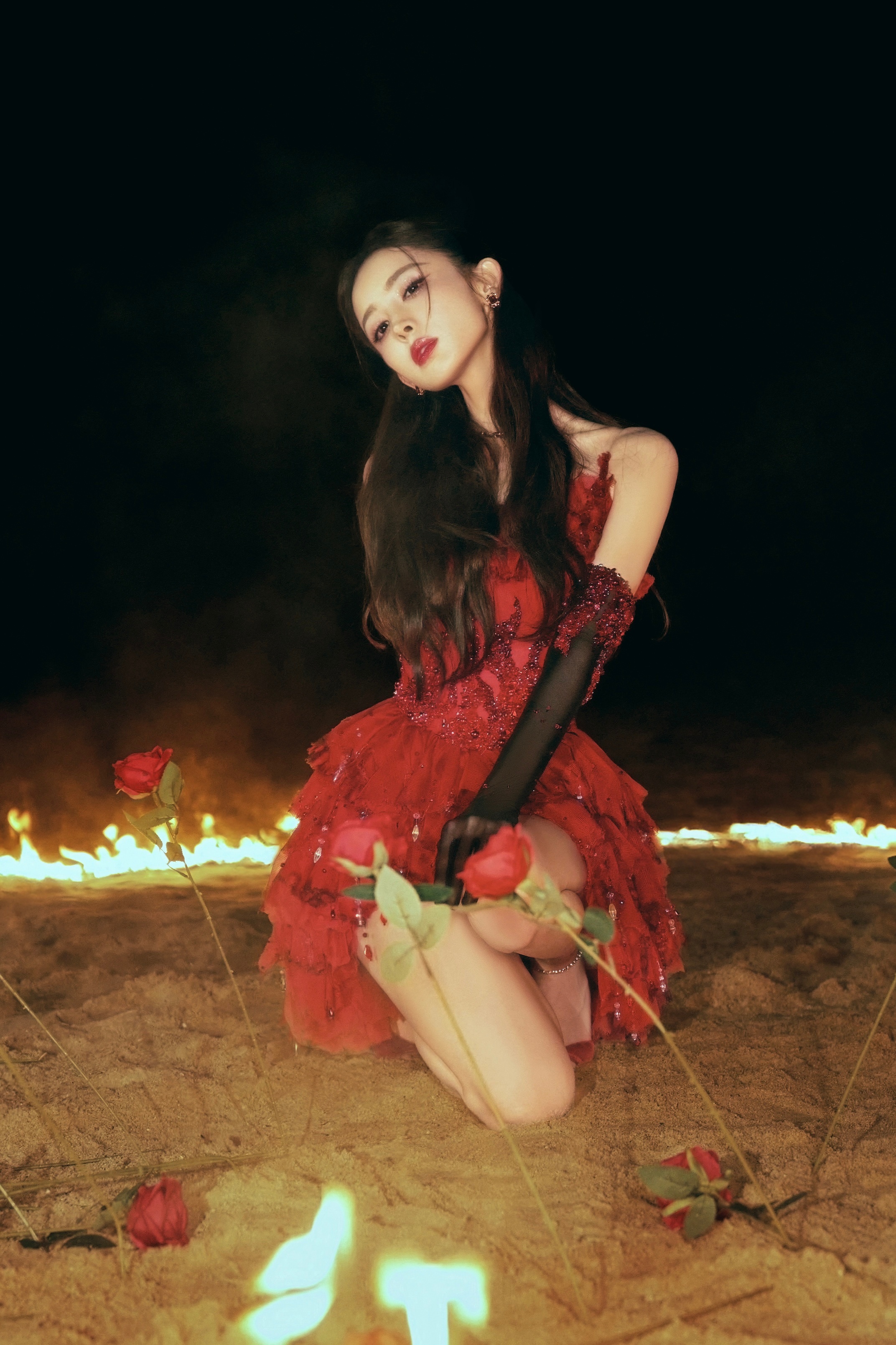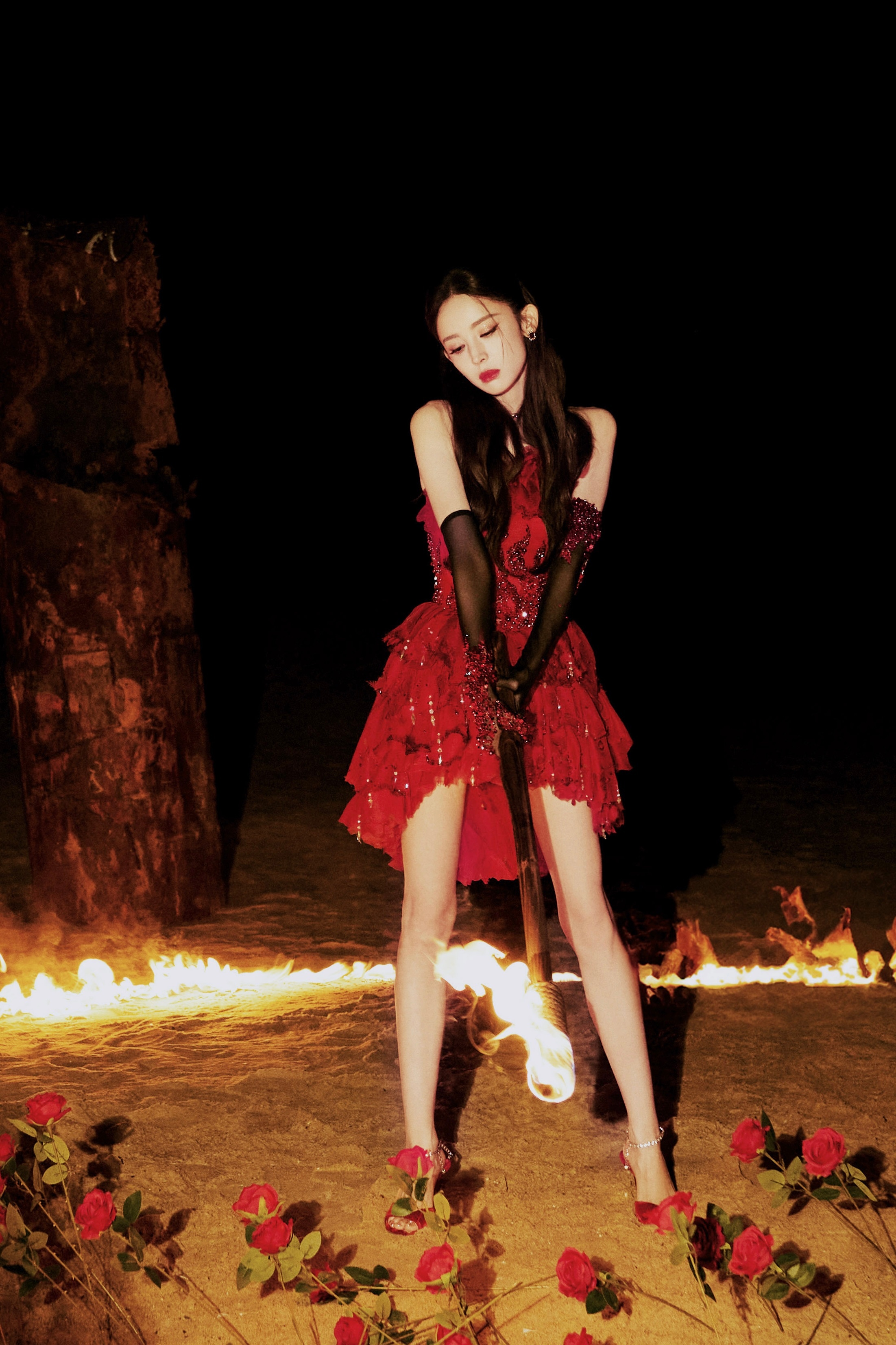 杨颖在落地窗前穿着百褶裙的baby妈妈