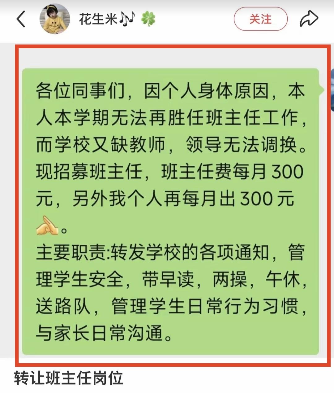 很多年前我曾经建议,中小学设立专职的班主任岗,专职班主任不用上课,就负责管理班级学生,就像大学的专职辅导员一样。 今天看到一位老师转让班主任岗位,她自己觉得自己难以胜任班主任岗位,(其实多半是太累了身体受不了),除了学校的补贴以外她自己还掏钱,但这个班主任岗位能转让出去吗?挺难的。 很多学校开学都为班主任而发愁,如果不是因为评职称需要班主任经历,很多老师都是不想当班主任的。 对于班主任这一块,我是有足够的发言权。我教了24年书连续当了23年班主任,经历了教育的很多发展阶段,深知班主任真的越来越不容易。以前班主任面对的可能是铺天盖地的检查验收创建和各种各样的活动进校园,现在班主任面对的最大难题就是安全问题,一个学生出了问题,班主任真的非常麻烦。 现在的情况是任课老师兼任班主任,语数英等老师在课时量满的情况下,担任班级的班主任。说实话,真的挺忙的,太多繁杂事情了,如果班主任把一学期的繁杂事情记录下来,估计一个本子都不够用,所以不少班主任真的有非常严重的焦虑情绪。教育