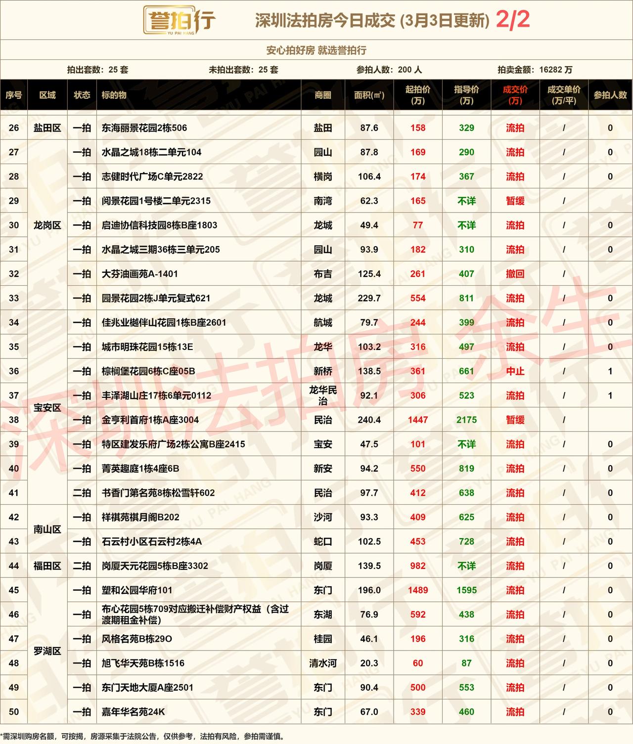 深圳法拍房:3.3成交,200人抢25套房/坂田房20人抢~ 1、200人抢25套房,7套房参与人数超10人 2、万科城,一楼带院子,20人抢,加价80% 3、蔚蓝海岸,9.9万拿下,很火,周边天骄华庭还有好房在拍 4、香山美墅,2038万成交,比预期价格要低点,价格很不错 5、熙园,预期价格成交,近期香蜜湖还有多套好房在拍 6、兰江山第,7.6万拿下,还不错,同小区还有一套好房6折拍卖 7、塑和公园华府,一楼带花园,二拍降到6万,有兴趣可以关注下
