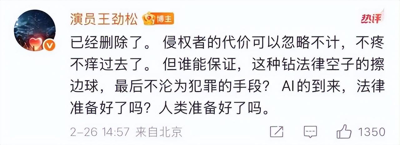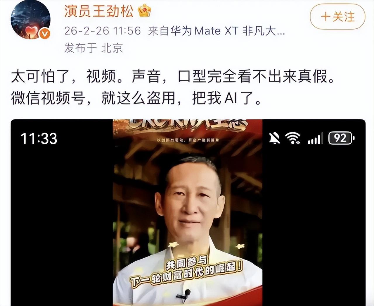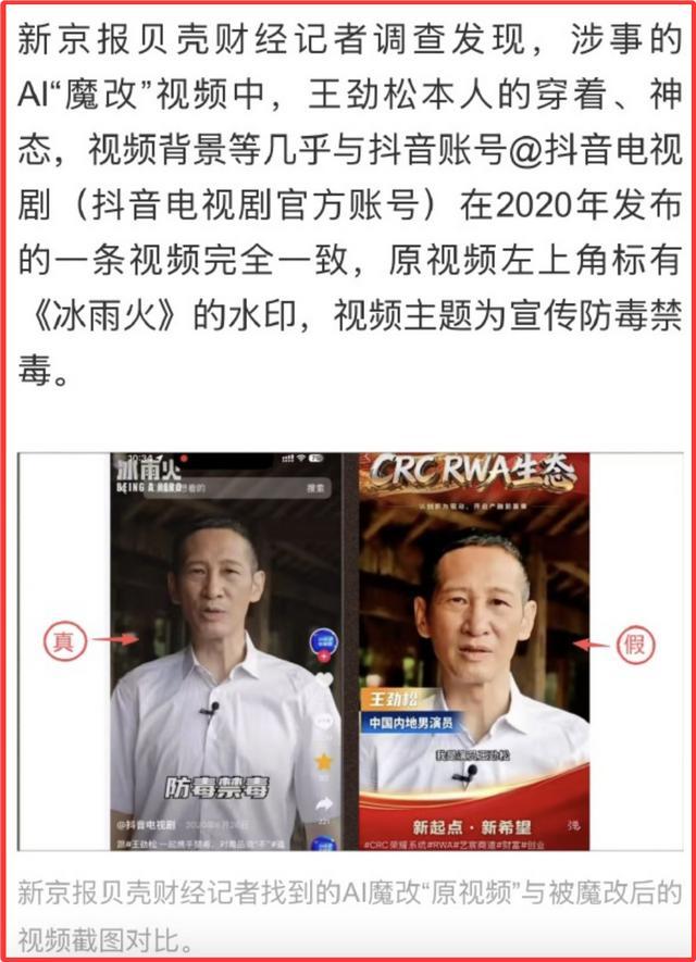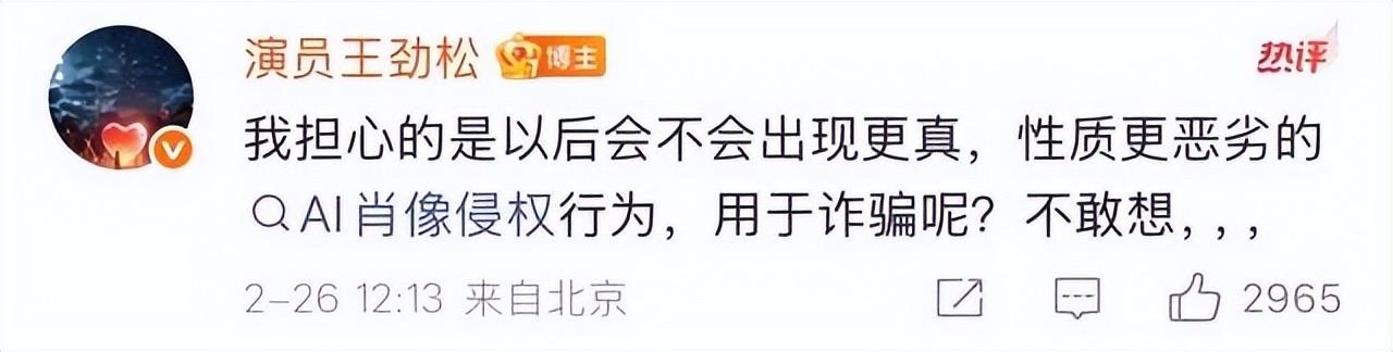 王劲松愤怒举报后续:官媒发声,终于有人意识到靳东的含金量 人在家中坐,祸从天上来! 2月26日,王劲松愤怒发文:“太可怕了,视频。声音、口型完全看不出来真假。” 并附赠了截图和视频,原来他发现自己的形象被盗用了。 这个视频中的他,不管是从模样,声音,口型,任何方面都看不出来真假。 如果不是王劲松本人出来澄清,这个视频里的他是被AI出来的,相信很多人都看不出来。 王劲松火速举报了该视频,平台也立马下架了该视频。 但这件事,却让王劲松心生恐惧,质疑此类事件以后是否还会发生。 王劲松痛心疾首地曝光此事后,多家官媒下场报道,并对涉事账号进行了详细地调查。 而作为叔圈天花板的靳东,更曾因为假视频,闹得人尽皆知。 这个“假靳东事件”当年可是闹得很大的,就连他的父母都被那些假靳东的视频给骗到了。 靳东很无奈,事发后他也是第一时间站出来解释。 可那些被骗的女性,还是对他痴心一片。 更有甚者,认为出来辟谣的本尊才是冒牌货,是自己家人找来拆散自己跟靳东的。 当时央视也是对这事件进行了播报,没想到,到现在为止这样的事情还层出不断。 还除了王劲松、靳东、李连杰外,被AI造假的明星还有很多。 只能说明星们在维权的道路上还任重道远,而互联网如今的环境也确实需要用一些强硬的手段进行整治了。 您对此事有什么看法呢?