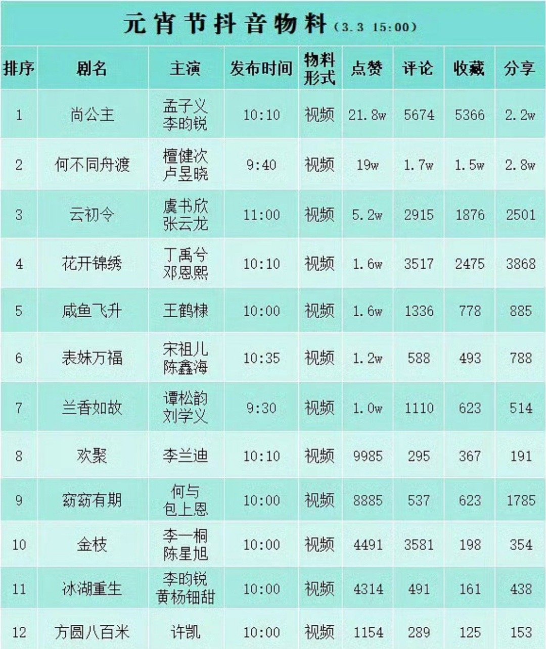 元宵节抖🍠物料热度:檀健次卢昱晓何不同舟渡和孟子义李昀锐尚公主在两个平台榜单都