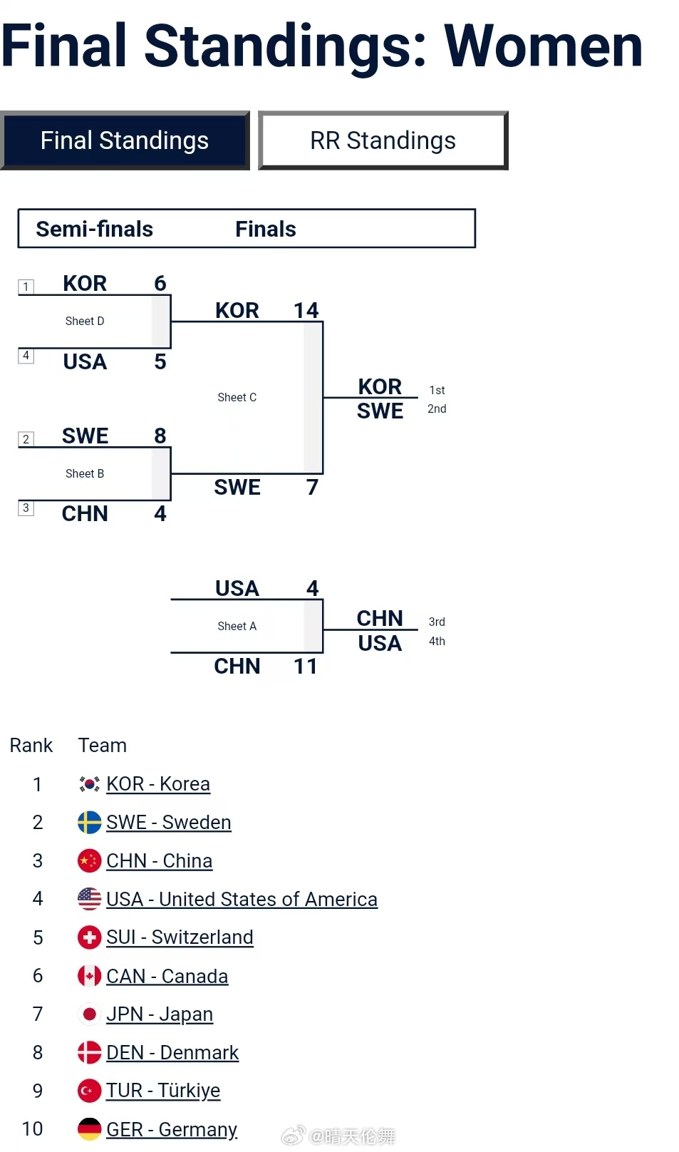 2026年冰壶世青赛女子收官日金牌赛🇰🇷韩国 14-7 🇸🇪瑞典,姜宝贝率领的韩国队卫冕世青赛女子冰壶冠军,也是韩国队历史第二个世青赛冠军,Moa Dryburgh率领的瑞典队继2022年后再度获得亚军,也是Moa Dryburgh第二度登上世青赛领奖台铜牌赛🇨🇳中国 11-4 🇺🇸美国,由主教练金智善(徐晓明老婆)带领的上海女队为班底的中国队获得本届世青赛女子季军,这也是中国女队时隔8年登上世青赛领奖台!