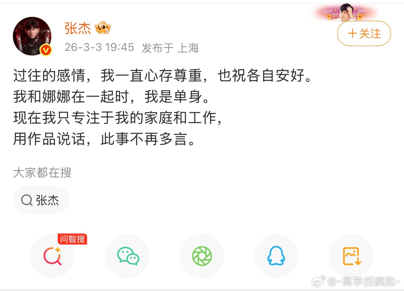 张杰出来回应了 当时他是单身并没有出轨 张杰回应