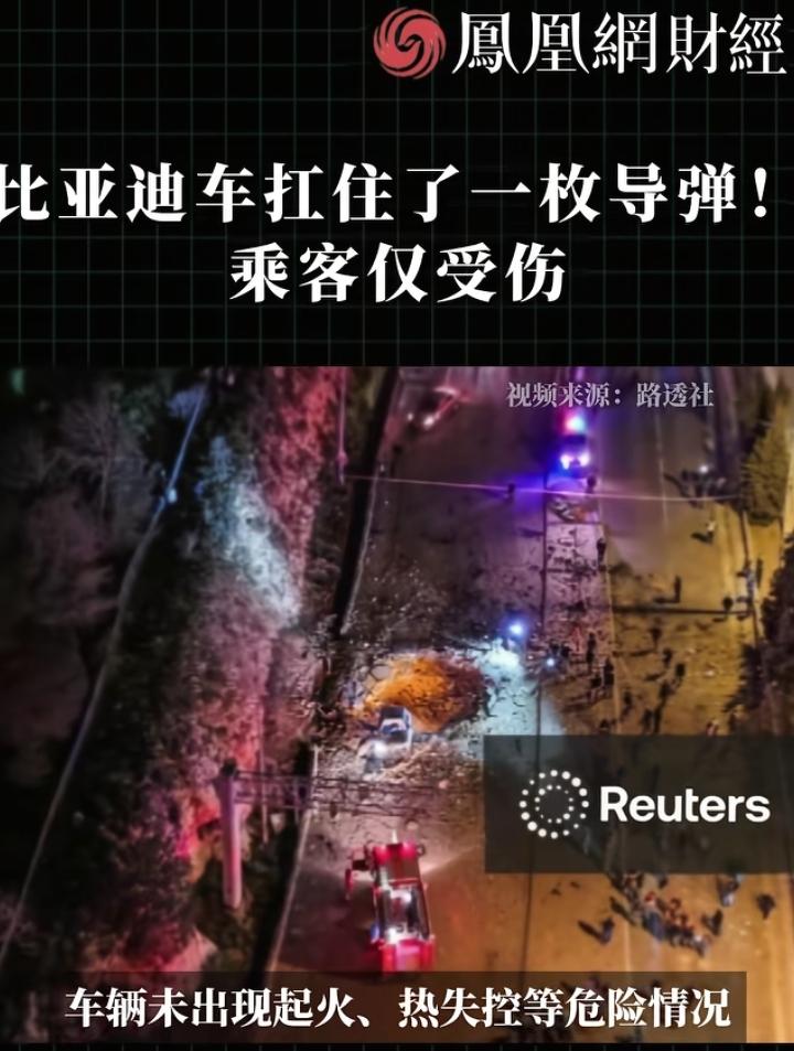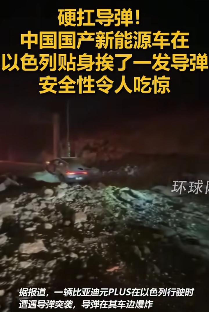 这是车坚强?一辆比亚迪元在以色列硬抗了一发导弹。 以色列的比亚迪车主,在开车途中贴身挨了一发导弹。 车上五人,车主受中度伤,两人轻伤,其余两人毫发无损。 从现场视频来看导弹爆炸力威力巨大,留下了很大的弹坑,而那辆比亚迪车就离弹坑不到两米的距离。 全车板金变形,但整体完好,无烟无火,车门能打开,车灯正常。 这是民用车辆能做到的? 该条视频已有环球网等大媒体转发。