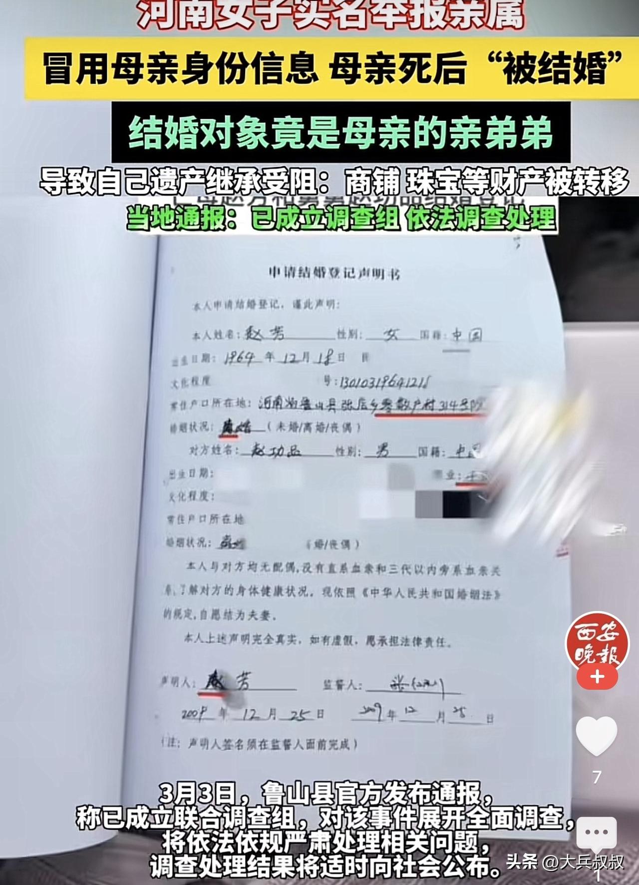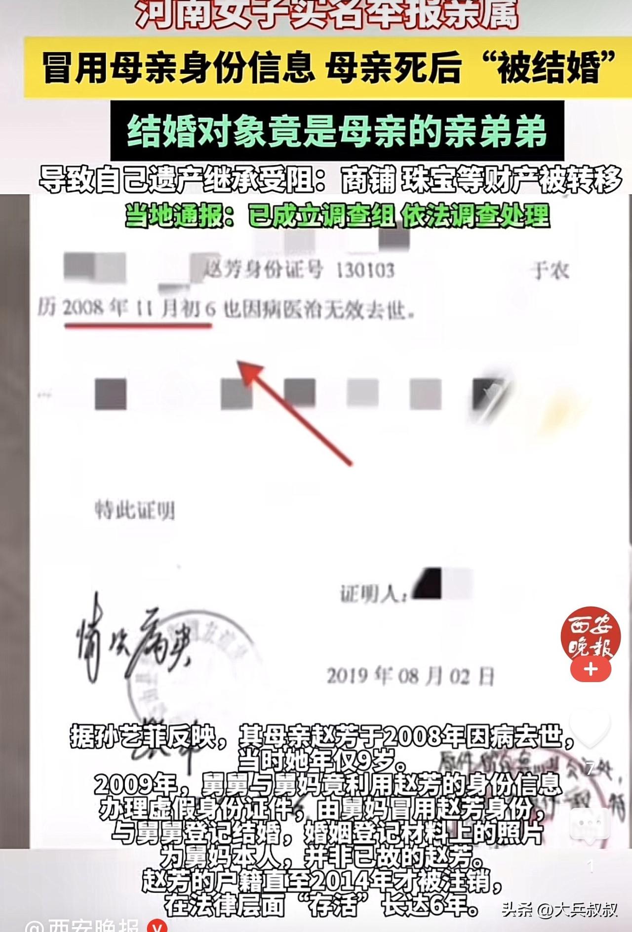 河南,一女子母亲去世后,女子因年龄太小就被小姨带去抚养,等女子成年后,打算继承母亲的遗产,结果发现母亲名下只有商铺,而女子也不是母亲唯一的女儿,事后女子发现,母亲竟然在去世后和舅舅结了婚,于是女子将此事曝光,当地表示已经成立了联合调查组。 据孙女士陈述,在08年的时候自己才9岁,当时母亲就因重病在医院治疗,母亲出院当天一共是发生了三件事情,第一办理了财产公证,第二是办理了抚养权公证,自己被小姨抚养,第三就是办理了出院手续并在当天逝世。 此后,孙女士就被断绝了和亲生父亲的往来,待孙女士成年后,孙女士打算继承母亲的遗产,因为据孙女士介绍,母亲生前有大量珠宝,还有房屋和商铺,但等自己真的继承时发现仅仅有商铺,而房产竟然被小姨给卖掉了。 更让孙女士无法接受的是,在母亲去世之后,母亲竟然和舅舅结了婚,而且孙女士竟不是母亲唯一的女儿,所以,孙女士感觉天都塌了。 事发后,当地有关部门表示已经成立了联合调查组,对此事进行调查。 网友则表示,就算是她母亲和她舅舅结婚,在法律上他们是近亲属,怎么审核通过的,太不可思议了。 还有网友说,太离谱了,这说明有人拿着这个女的母亲的身份活了十多年,这十多年来,把女子的家产全部侵吞了。 目前,有关部门正在就此事进行调查,但是,孙女士母亲的房子被小姨卖掉之后,房款也打给了小姨,除非这笔钱能够证明,用于了孙女士的抚养和生活,否则的话,小姨是需要如数返还的。 民法典第三十五条规定,监护人应当按照最有利于被监护人的原则履行监护职责。监护人除为维护被监护人利益外,不得处分被监护人的财产。 所以,如果小姨不能够证明卖房子的钱用于了孙女士的生活,那么,小姨是需要返还这笔钱的。 与此同时,孙女士母亲和其弟弟结了婚,这在法律上其实属于无效婚姻,民法典第一千零四十八条规定,直系血亲或者三代以内的旁系血亲禁止结婚。 所以,孙女士和弟弟的婚姻,其实是属于无效婚姻,但是,民政部门往往只是对婚姻做形式审查,而不是实质审查,如果核查的不细致,如果孙女士的母亲和妹妹长得相似的话,不排除是妹妹(即孙女士小姨)冒称孙女士的身份,和孙女士的舅舅结婚的可能性。 如果两方为了孙女士母亲的财产而做出这样的安排,也不是没有这个可能性,当然,这只是一种猜测,事实如何还是要看有关部门的调查。 涉事人员是否会牵扯到刑事犯罪的问题,其实也是很有可能的,即孙女士母亲和其弟弟结婚,如果是有人冒称的,那么,冒称的人在已婚的情况下,是存在构成重婚罪可能性的,如果其舅舅知情,也算是同犯,也应承担重婚罪的责任。 当然,如果是两方联手分孙女士母亲的遗产,那么,两方就是在以隐瞒事实的情况下,擅自处分他人财产,这有可能定盗窃或者是诈骗,到底真相如何,我们还是拭目以待。 对此,你对本案有什么看法? —————————— 关注我,带你评析法律热点,关注冷暖人生。 文章原创,抄袭必究