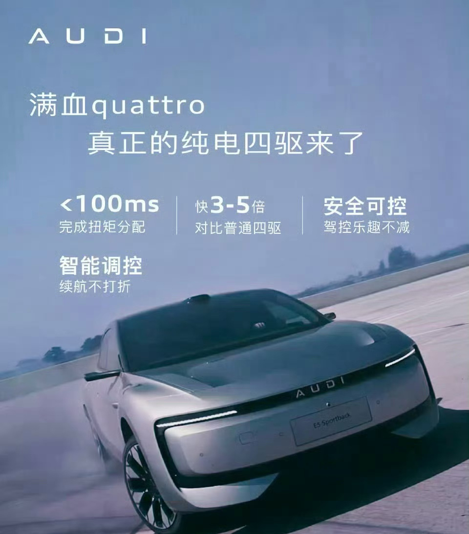 在纯电时代,什么样的车才算厚道?不是把屏幕做得越来越大,也不是把0-100加速吹得越来越玄乎,而是在你看得见和看不见的地方,都给你顶级配置。 奥迪E5 Sportback现在20.59万起,quattro版23.99万,打开配置表你会发现,这车简直就是“配置狂魔”。 先说三电:全系标配宁德时代100度大电池(部分版本),CLTC最高续航773公里。宁德时代什么水平?全球动力电池一哥,几乎所有高端电动车的首选。搭配800V高压平台,充电10分钟就能补能380公里,喝杯咖啡的时间,续航焦虑就没了。 再说驾控:quattro四驱,前后超跑用的鸳鸯胎布局,0-100%扭矩无级分配,日常后驱有乐趣,雨雪湿滑路面稳如泰山。前双叉臂后五连杆,高配还有空气悬架+CDC可变阻尼——这套底盘放在燃油车时代是百万级豪车才有的待遇。难怪有人叫它“山脊之王”,跑山劈弯相当稳。 还有可靠性:奥迪E5诞生于上汽奥迪AUDI智造基地,严格执行奥迪全球统一工艺标准,历经“两冬两夏”全气候极端路况测试、16项高压安全检测,最后还要送到德国奥迪总部实验室做最终认证。这就是德系品质的执念——你看不到的地方,它替你死磕。 20.59万,买到的不仅是一台好看的猎装轿跑,更是一套100度大电池+800V快充+quattro四驱+德系工艺的硬核组合。奥迪用这波“开年王炸”告诉你:豪华品牌厚道起来,真没新势力什么事了。