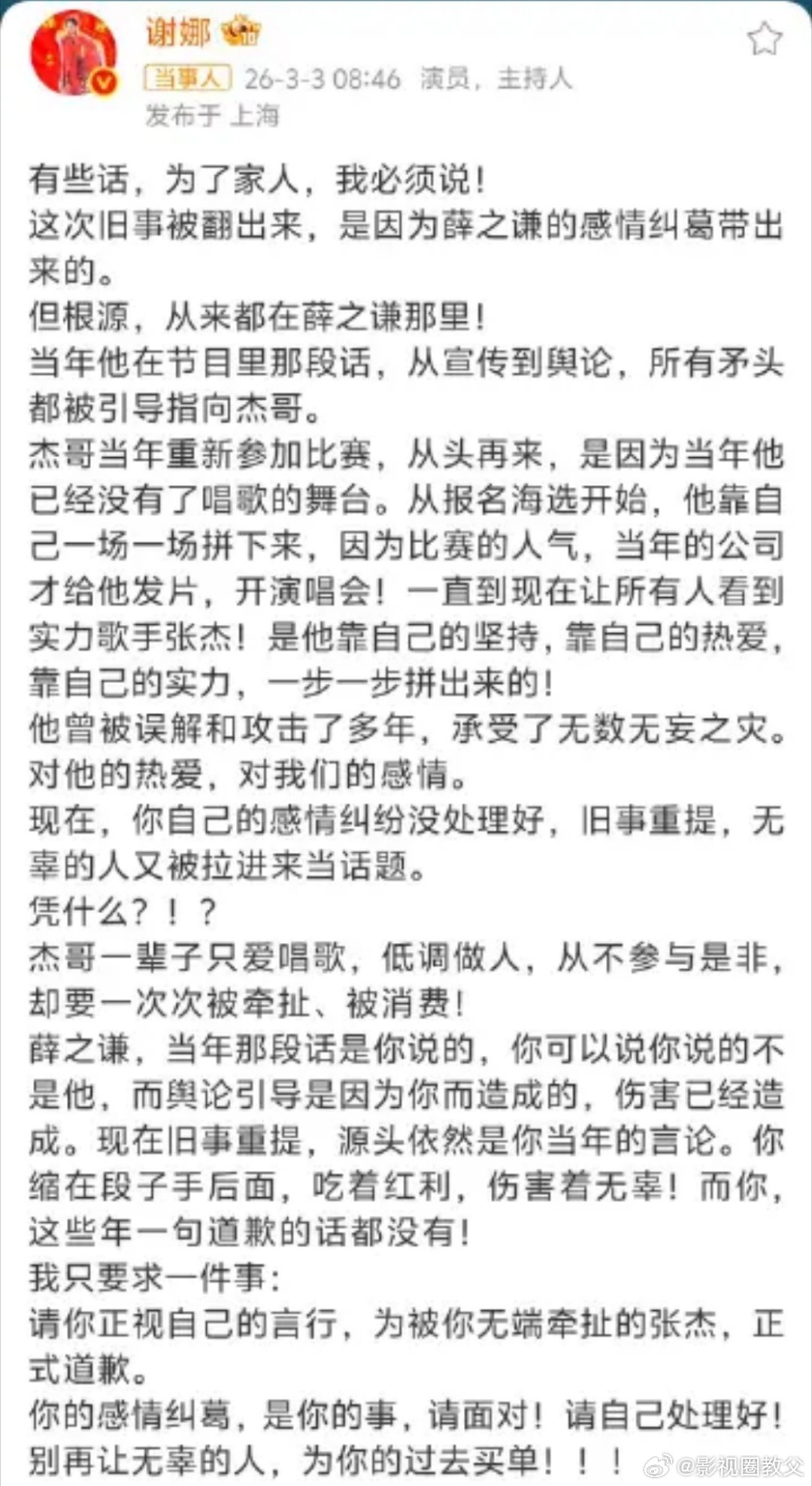张杰前女友力挺薛之谦这个转变真的没人能想到吧,最开始是李雨桐和薛之谦的纠葛,后来变成了张杰和薛之谦的纠葛,最后因为薛之谦曾帮助过张杰的前女友又发展成了张杰前女友和张杰谢娜的纠葛,感觉真是越来越乱了,真的很想看看最后会发展成什么样