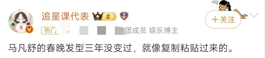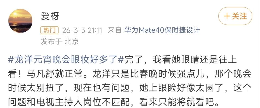 元宵晚会看完我算是发现了,央视主持人们的内卷,从春晚到元宵就没停过。 都说过完元宵才算过完年,每年这时候的元宵晚会,除了节目,大家最爱扒的就是主持人的状态。毕竟从春晚到元宵才半个月,谁扛住了央视的死亡高清镜头,谁偷偷调整了状态,观众的眼睛比放大镜还灵。 今年主会场还是六位熟面孔:任鲁豫、撒贝宁、尼格买提、龙洋、马凡舒、刘心悦。但整场看下来,有人进步明显,有人原地踏步,有人意外圈粉,也有人真的让网友操碎了心。 先说说龙洋。 这位从春晚美到元宵的女主持,这次是真的在细节上下了功夫。最明显的变化就是眼妆,之前的妆容偏淡,这次眼线画得更精致,眼影也加了层次感,整个人的精气神一下子就提上来了,镜头里特别亮眼。 而且导演组这次是真给她排面,专门安排了她和任鲁豫坐观众席介绍美食的环节,怼脸近景给得足足的,相当于直接给了她大把和观众“面对面”刷好感的机会,这个待遇真不是谁都有。 比起龙洋的微调进步,马凡舒这次真的让网友们集体“恨铁不成钢”。 不是说她状态不好,是这个发型!我真的要怀疑是不是半永久焊在她头上了——从春晚到元宵,厚重的齐刘海+高颅顶造型,连蓬松度都没怎么变,跟复制粘贴过来的一样。这种偏硬偏厚重的造型,和她本身灵动清爽的气质完全不搭,硬生生把人衬得很拘谨,完全没放开。 评论区全是网友的吐槽:“马凡舒这个春晚发型三年没变过吧?真的看累了”。大家真不是挑剔,是太可惜了她的条件,明明换个轻盈点的造型,能比现在出彩太多。 说到造型,这次最圈好感的其实是刘心悦。 39岁的状态是真的能打,最绝的是她的发型,没有刻意追求央视主持人那种一丝不苟的顺滑服帖,反而留了点发际线的小绒毛和细碎的胎毛,整个人一下子就活了,没有端着的距离感,俏皮又自然,看着比实际年龄小了好几岁。 果然,有时候不刻意追求完美,反而才是最讨喜的。 这次还有个不小的惊喜,就是朱迅的亮相。 她一出来,弹幕里全是“好久没见朱迅了,太想念了”。状态是真的稳,笑容还是那么有感染力,控场的气场一点没减。而且她这次的造型还挺敢的,用了央视主持里很少见的橘色系眼影,连发色都和其他主持人不一样,和刘心悦站在一起,一个沉稳大气,一个灵动鲜活,新老主持同框的画面,还挺戳人的。 最后当然少不了我们的气氛担当,撒贝宁和尼格买提。 不知道是不是打光的原因,小撒这次看着比春晚白了好几个度,小尼还是一如既往的活宝,有他俩在的地方永远不会冷场,插科打诨的样子,把元宵晚会的氛围衬得特别松弛热闹。 总的来说,这次元宵晚会的主持阵容,整体比春晚放松了太多,毕竟年快过完了,大家也都卸下了春晚那股紧绷的劲儿。 但该卷的地方一点没落下:龙洋在抠细节补短板,刘心悦靠自然感圈粉,朱迅凭气场稳赢,只有马凡舒,被半永久的发型给封印住了。 说真的,观众的审美一直在变,也期待下次亮相,能看到一个造型更轻盈、状态更放开的马凡舒,别再被发型耽误了。