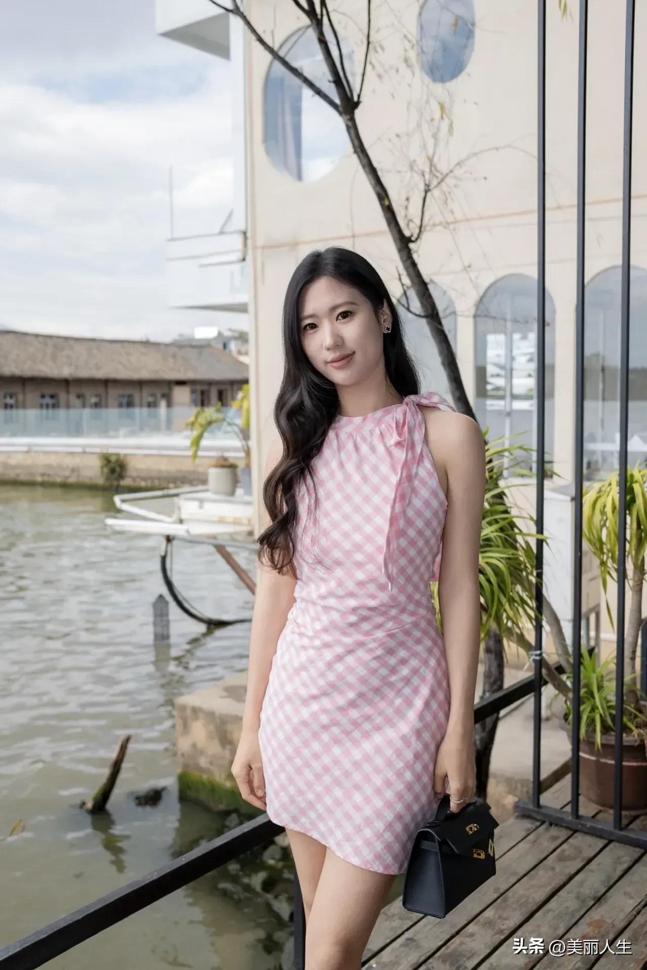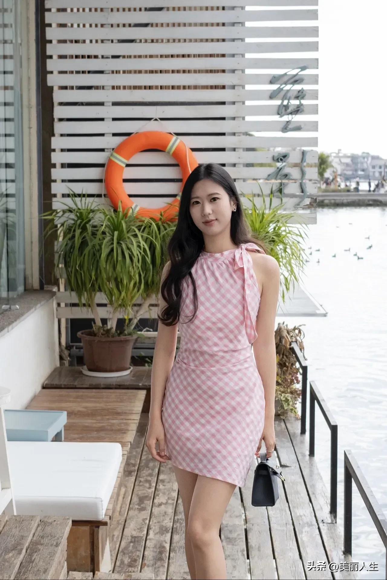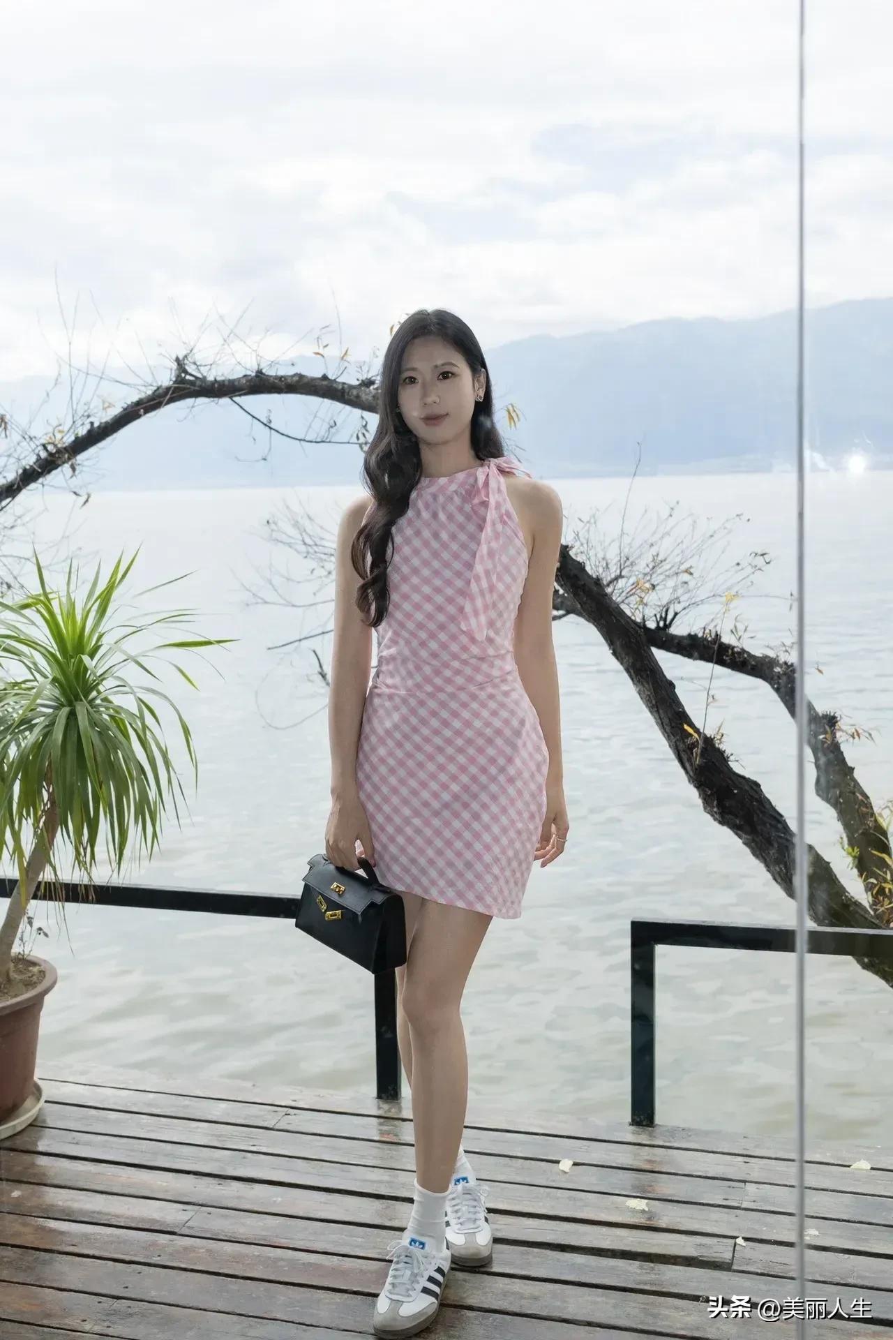 优雅蓝裙搭配,车内的时尚自拍