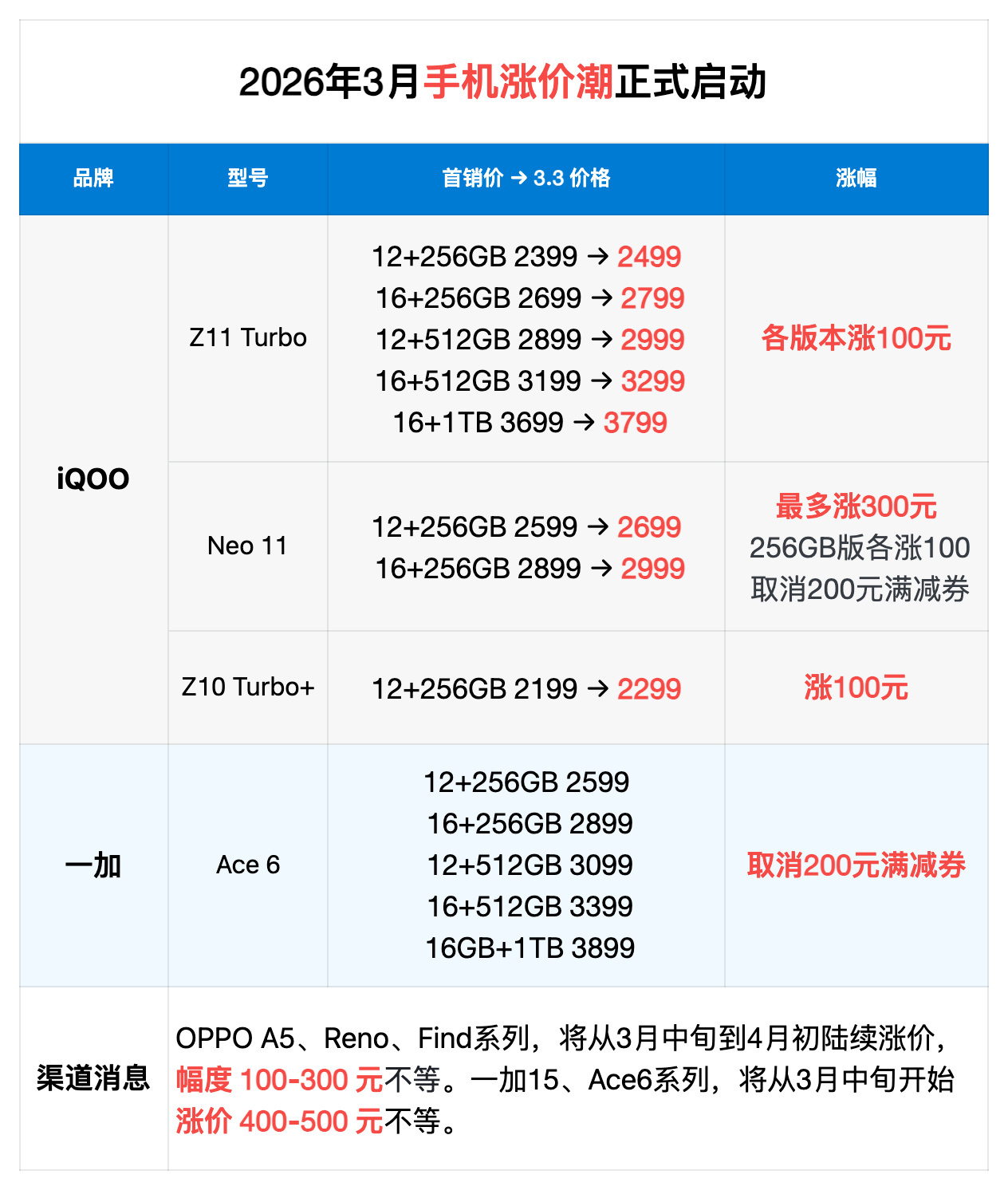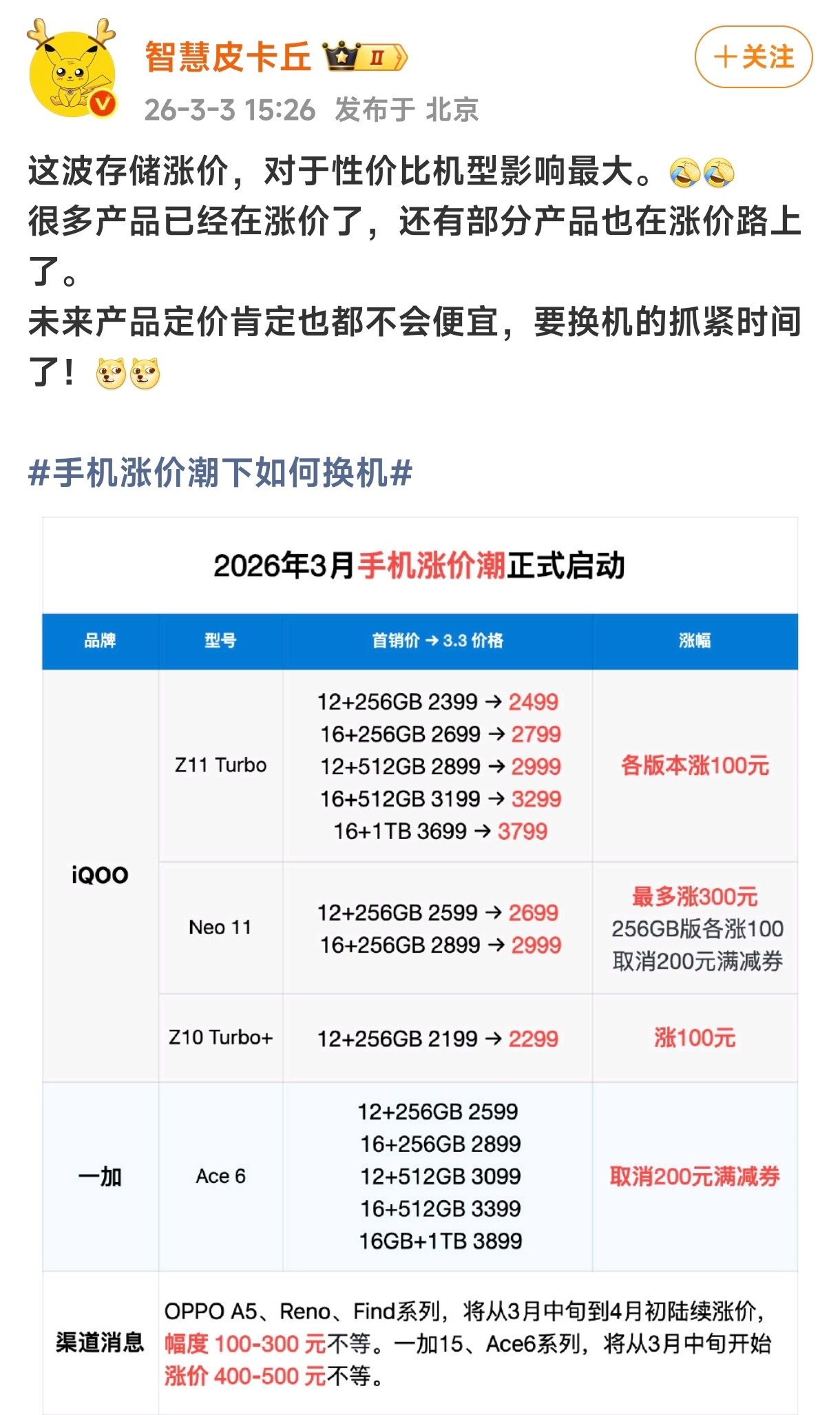 坏了 兄弟们……这次是真的「狼来了」,不少网友发现,有些机子的价格真的在上调了😂看来这内存涨价的威力彻底显现,不光3月即将发布的新机难逃涨价,就连年前上架的多款机型也扛不住成本压力率先调价。主打性价比的机型受冲击最猛,涨幅也最明显,反观溢价高的高端机因利润空间大,目前还稳得住。这波涨价潮才刚开始,想换机的真得趁早下手,越等只会越贵!
