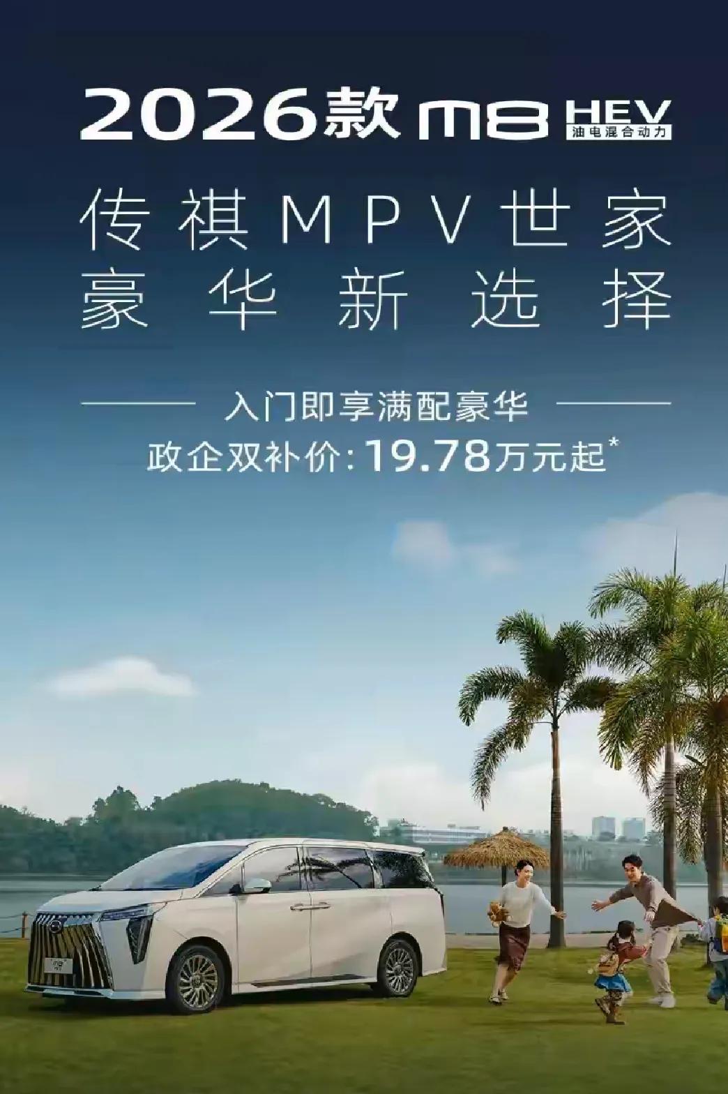配置超过腾势D9,价格比夏还便宜。腾势D9看了都直摇头,国产MPV再出王炸!传祺M8 HEV直接杀进19万级 说起国产高端MPV,腾势D9绝对是一个时代的标杆,而在它之前,真正能站稳高端市场的国产MPV,只有广汽传祺M8。多年来靠硬核实力、销量口碑双丰收,早已成为80万用户的选择。 谁也没想到,2026款传祺M8 HEV一上来就王炸开局,直接把豪华混动MPV拉入19万时代,价格比同级竞品更亲民,诚意直接拉满。 曾经广汽依靠合资品牌打下坚实基础,如今自主品牌全面崛起,传祺、埃安、昊铂轮番上阵,而传祺M8更是MPV世家的当家车型,销量、品质、保值率全线在线。 2月24日,2026款传祺M8 HEV正式上市,政企双补后仅19.78万起,提供尊贵版、至尊版两款配置,对于一台中大型混动MPV来说,这个价格堪称颠覆。 车身尺寸5212×1893×1823mm,轴距3070mm,标准2+2+3七座布局,外观大气稳重,内饰豪华舒适,家用、商务都撑得起场面。 动力更是它的核心亮点: 搭载2.0TM混动专用发动机+行业首创串并联两挡双电机混动,搭配2挡DHT变速箱,排量更大、热效率更高、直驱能力更强。 发动机额定功率140kW,峰值扭矩330N·m,WLTC综合油耗低至6.15L/100km,一箱油续航1057km,强动力还省油,长途完全无焦虑。 智能配置同样拉满: 配备ADiGO Pilot L2级智能驾驶+ADiGO Space智能座舱,12.3英寸仪表+14.6英寸中控屏,全系标配高通8155芯片,支持多模交互、四区语音,搭配5摄像头+6超声波雷达+360°全景影像,好用又安心。 这台车最狠的地方在于: 它没有把混动做成“减配廉价版”,而是在大空间、强动力、低油耗、高智能的基础上,把门槛压到20万以内,彻底解决了大家“想买混动MPV但预算不够”的痛点。 从老牌MPV强者,到新时代混动卷王,传祺M8 HEV用实力证明: 20万级家用混动MPV,它真的可以闭眼冲。