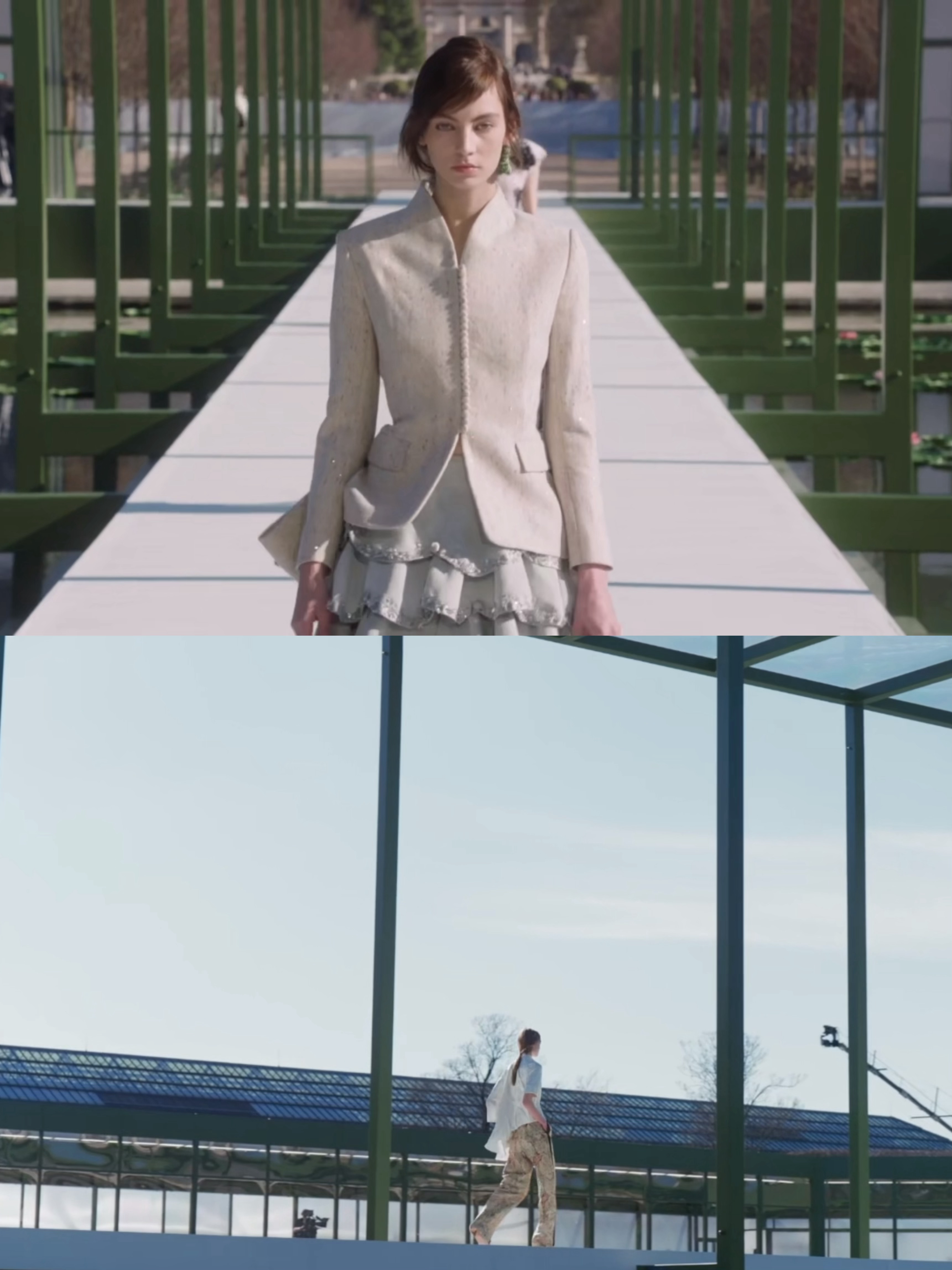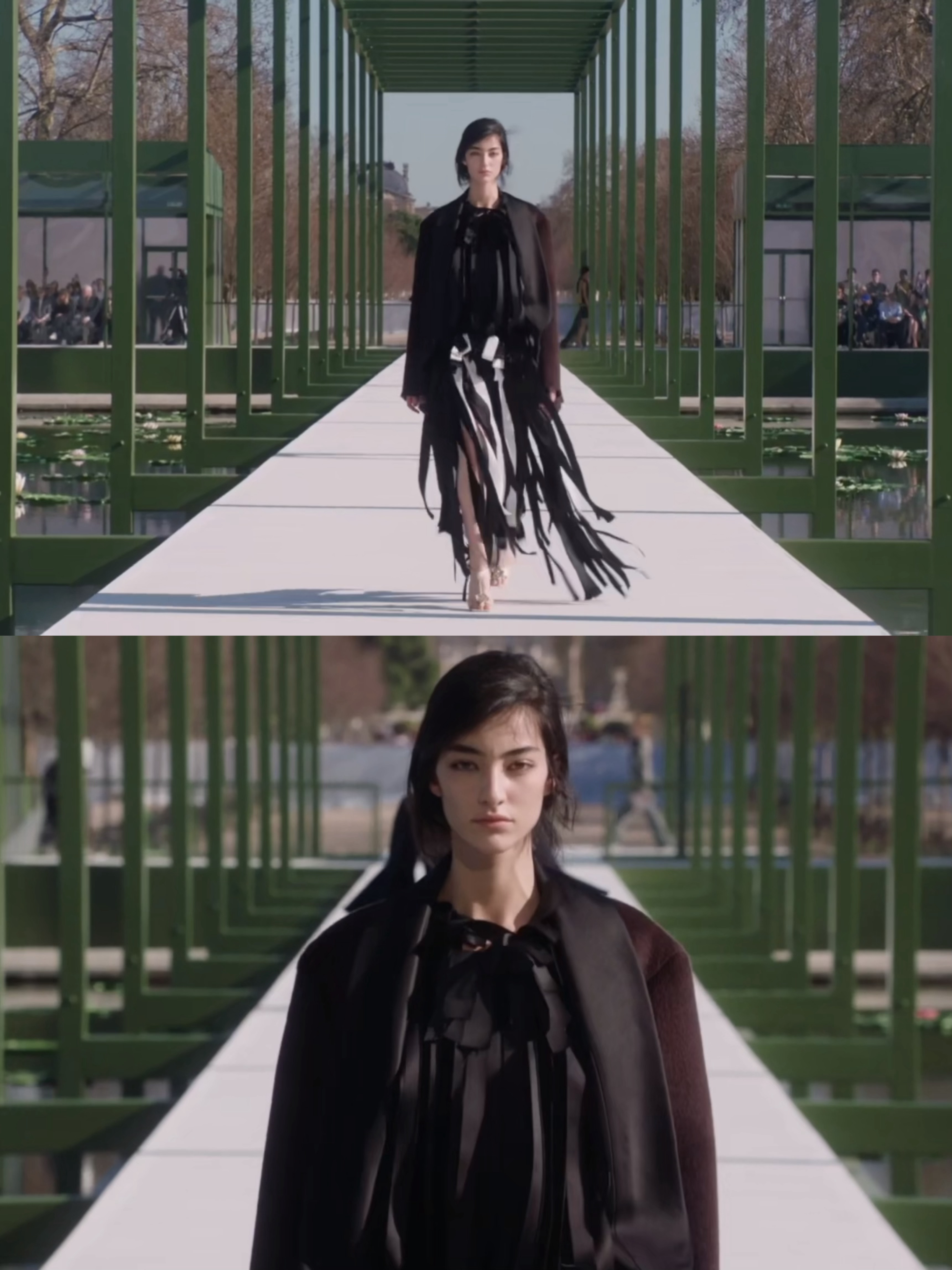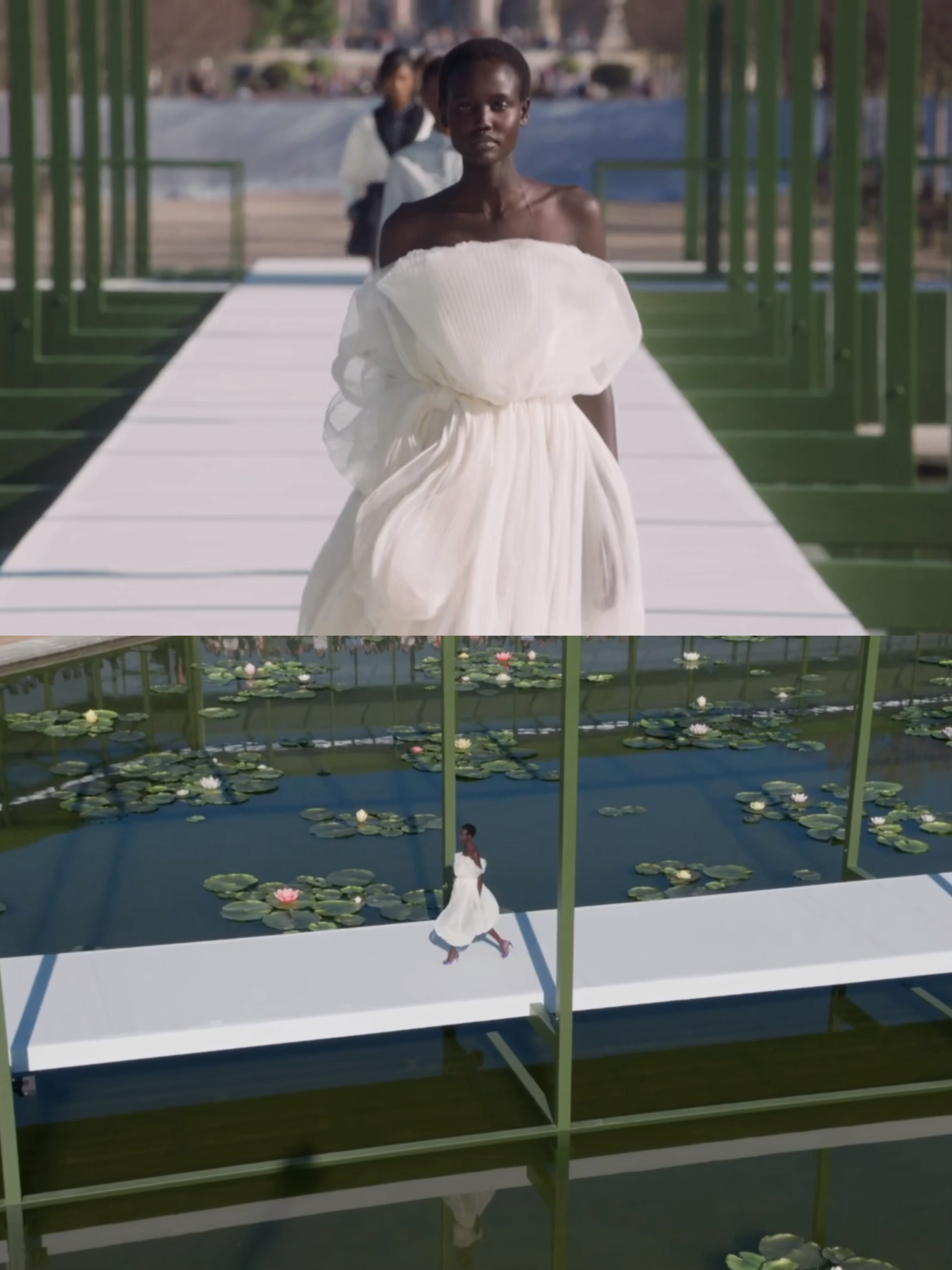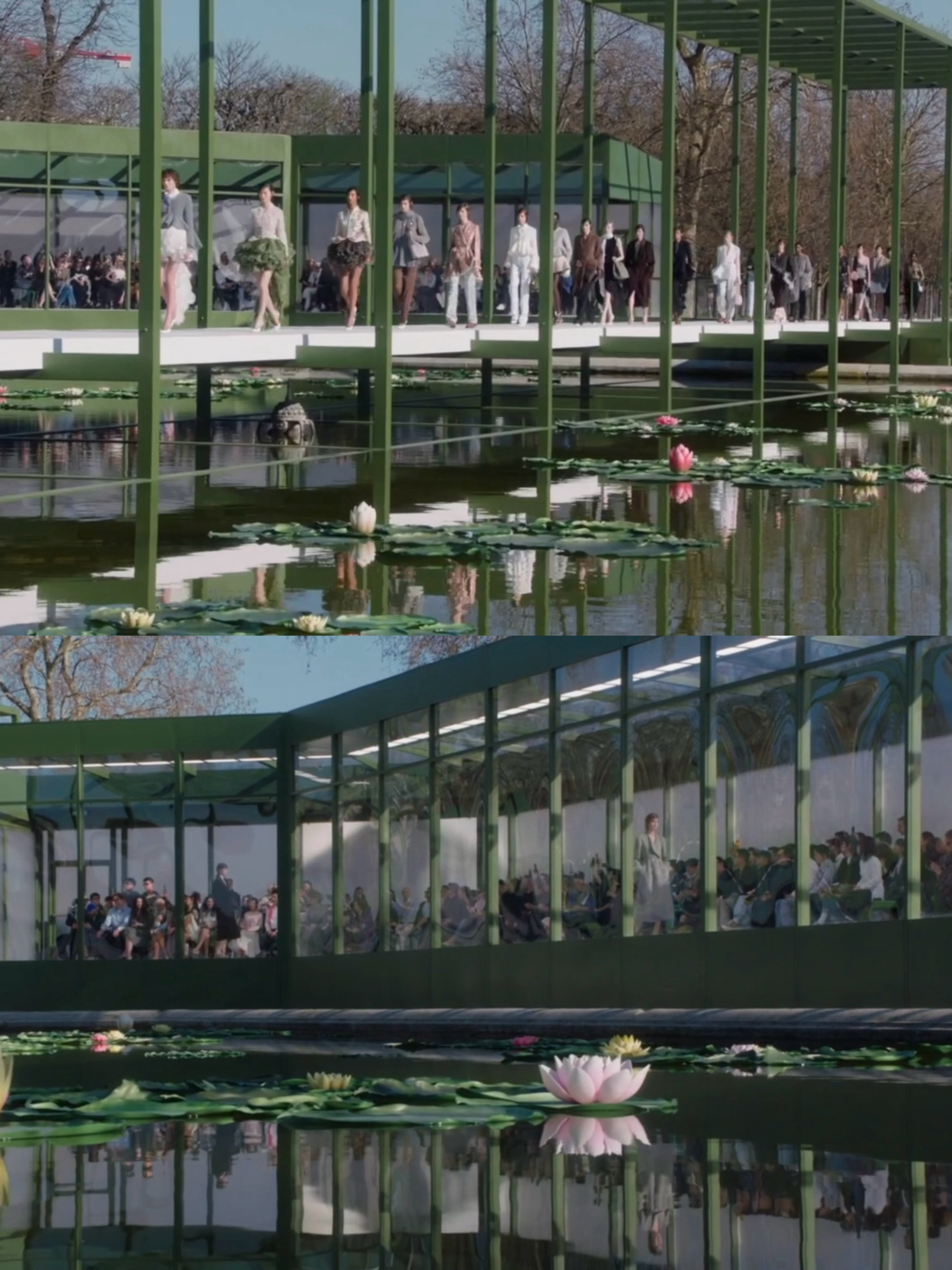 这次Dior秀场直接做成水上花园,水面摆着睡莲,氛围感拉满。舞台有绿色框架,像园林屏风,搭配睡莲雕塑,东方感很足。衣服上用了立体莲花、花卉刺绣和薄纱面料,下摆也做成花瓣波浪感,把莲花元素融得高级又自然。