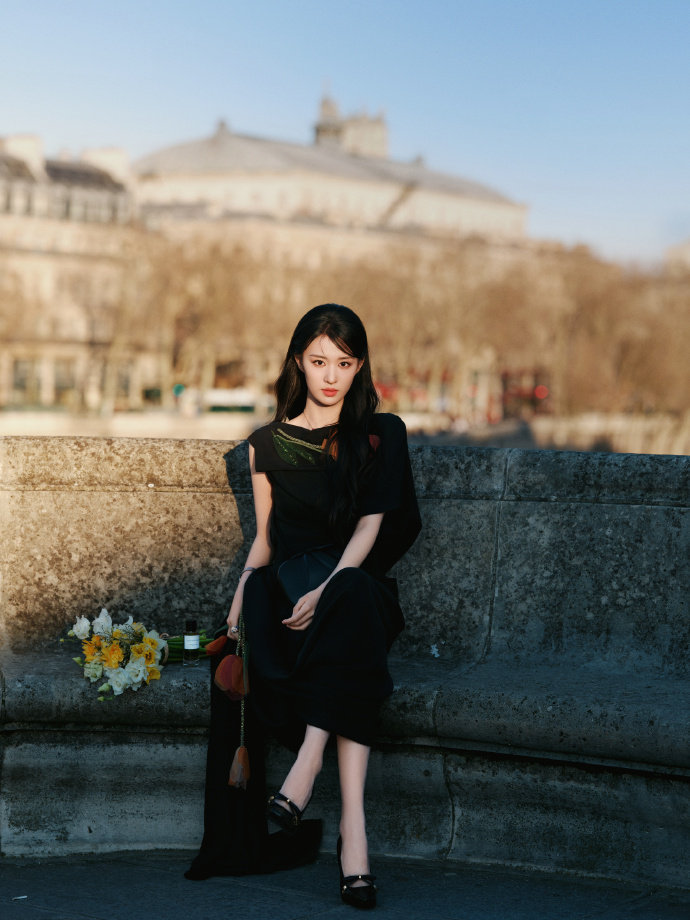 看秀造型各有韵味:品牌大使李昀锐蓝格纹衬衫配铜色阔腿裤,流苏肩章点睛,诠释新贵族式优雅;品牌大使王楚然黑色斜裁长裙缀立体花卉,红唇配花束,宛如一幅美丽的复古油画。