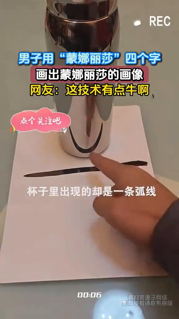 男子用"蒙娜丽莎"四个字画出蒙娜丽莎的画像。网友:这技术有点牛。 这是一个不锈钢杯,如果把它放在纸上,然后在纸上画一条直线,杯子里出现的却是一条弧线,那么只要控制好细节,画出一个蒙娜丽莎。